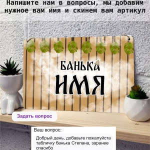 Если вы не нашли нужное вам имя, просто напишите нам и мы добавим его, после чего скинем вам артикул товара. Вы ищете, чем украсить свою баню, или хотите сделать оригинальный подарок другу, который обожает париться? Эти прикольные таблички баня – то, что вам нужно! Размер 20х30см идеально впишется в любой интерьер, а забавная надпись добавит каплю юмора в атмосферу отдыха. Эта табличка станет отличным дополнением к полке с банными принадлежностями. Именная табличка отлично смотрятся в интерьере и подчеркивают атмосферу домашней бани. Каждый элемент декора важен, и эта табличка – не исключение. Подарок для бани, который точно запомнится! А над упаковкой даже думать не придется – подарочная упаковка, атласная лента, и даже открытка для подписи идут в комплекте! Вы приобретаете не просто табличку, а готовый подарок по любому поводу и без повода! Наши таблички не боятся влаги и перепадов температур, так что ее можно смело вешать в помещении и на улице. Отверстия по углам позволяют выбрать любое крепление: гвозди,саморезы, кнопки. В комплекте так же идет шнур-подвес из натурального джута, который станет дополнительным элементом декора.