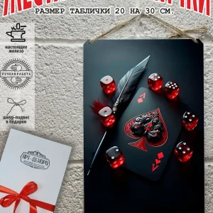 Представляем вам стильные и эффектные жестяные таблички с изображением игральных карт. Наши постеры — жестяные таблички покер, выполнены из металла, который отличается высоким качеством и долговечностью. Размер 20×30 см позволяет легко вписать наши картины в любой интерьер, будь то кухня, гостиная, офис или кафе. Почему стоит выбрать наш постер для интерьера? Яркие и насыщенные цвета не выгорают на солнце и делают ваше пространство выразительным и уникальным. Легкость в уходе: наши картины для интерьера, таблички блэк-джек покер мафия и постеры на стену виски и сигара можно легко мыть. Они не боятся влаги, что позволяет использовать их как в помещениях, так и на улице. Удобные варианты крепления: табличка может быть установлена на саморезы, гвозди, кнопки, клейкую ленту, магниты или повешена на шнур из натурального джута, который идет в комплекте. Упаковка: каждая табличка карта туз пики фэнтези красивые игральные карты колода казино аккуратно упакована в защитный пакет и дополнительно завернута в эко-картон, а также дополнительно в комплекте идет подарочная упаковка, атласная лента и открытка — что делает её отличным подарком на любой случай – от дня рождения до новоселья – готовый подарок. Мы гордимся тем, что предлагаем более 15 000 уникальных дизайнов, включая постеры на стену для интерьера, постер на заказ карты bicycle и прикольные металлические таблички, чтобы каждый мог найти что-то для себя. Наши постеры разделены на коллекции разных серий, что позволяет заказать несколько табличек в едином стиле и создать неповторимую композицию у вас дома, не упустите возможность сделать свой дом стильным – добавляйте товары в избранное, чтобы первыми узнавать о скидках и новинках! Создайте атмосферу уюта и стиля с нашими металлическими картинами и постерами для интерьера уже сегодня!