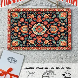 Ковер является многогранным символом: он олицетворяет уют и домашний очаг, а также выступает как оберег, отделяя мир человека от хаоса и защищая от зла. В культурном плане ковер символизирует статус и богатство, а в сказках — возможность путешествия и волшебства, например ковер-самолет. Каждый узор на ковре имеет свой смысл, от плодородия и долголетия до силы, мудрости и удачи, а центральный медальон может символизировать всевидящее око. В прошлом ковры были символом высокого социального положения, благосостояния и достатка. Узоры ковра, особенно центральный медальон, служат оберегом от зла и негативной энергии. Наша мастерская Арт-Декоро предлагает серию ковров на металлических табличках в стиле советских ковров в мини исполнении форматом 30 на 20 см. Такой ковер постер украсит рабочий стол, кухню, спальную, прихожую, гараж и любое место которое вы захотите. Наши постеры идут в комплекте с подарочной упаковкой, что делает его готовым подарком по любому поводу. Отличный подарок на день рождения для любителей советской эстетики. В комплекте так же идет шнур-подвес что упрощает его размещение на стене.