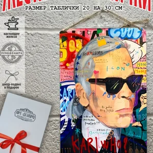 Интерьерная жестяная картина на стену с изображением Карл Лагерфельд выполненная из 100% металла- это отличный подарок, а также классный декор для помещения. Постер с изображением известных людей крепится на саморезы-шурупы, в табличке по углам имеются отверстия или на шнур-подвес из натурального джута, который идёт в подарок.