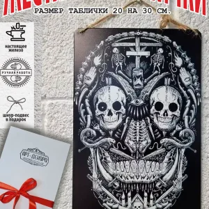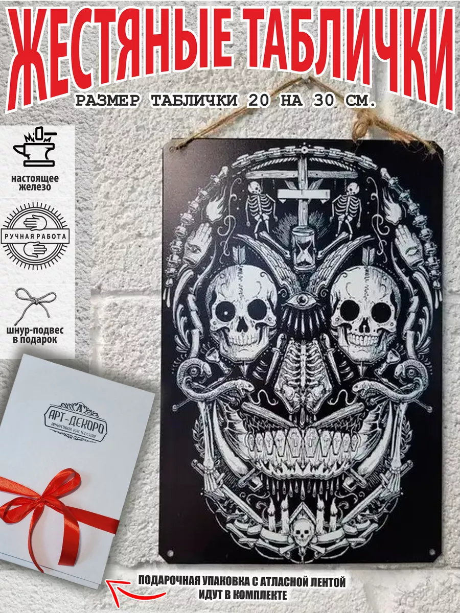 Железная жестяная табличка ручной работы, выполнена из 100% металла имеет классический размер 20*30 см. Края загнуты на 5 мм внутрь. Изображение наносится прямо на железо. Яркие насыщенные и объемные цвета. Табличку можно использовать как в помещении, так и на улице она не боится влаги. Варианты крепления таблички: на саморезы-шурупы, в табличке по углам имеются отверстия или на шнур-подвес из натурального джута, который идёт в подарок. Сделано в России. Упакована табличка в прозрачный открывающийся пакет для защиты от царапин при транспортировке. Внешняя дополнительная эко-упаковка из картона, подходит для подарка. Плакат череп — отличный подарок и стильный декор любого интерьера. Постер череп на жести советский- лучший подарок. Жестяная табличка череп — это отличный декор любого интерьера. Табличка на стену черепа — украшение кухни, дома, офиса, кафе, кофейни. Картина этот ретро стиль, всегда в моде. Подарок начальнику, другу, ретро постер на жести. Декоративная жесть — этот стиль всегда в моде это картина для квартиры и дачи. Вся коллекция табличек ч тематикой черепа в нашем профиле. Так же в нашем магазине более 15 000 видов табличек из разный коллекций, каждый найдет себе по душе! Добавляйте товар в избранное, что бы первыми узнавать о скидках и новинках.