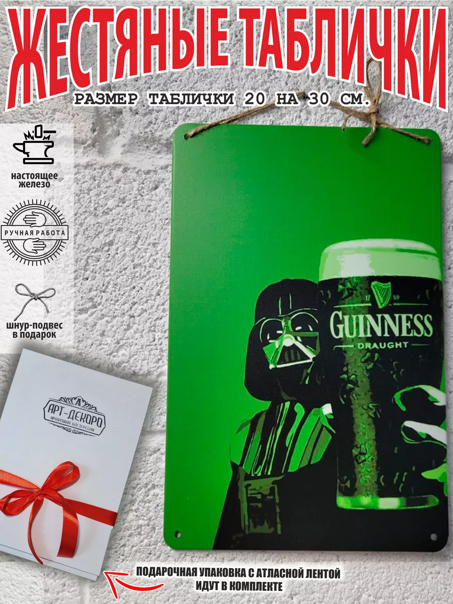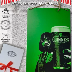 Табличка «Дарт Вейдер и пиво Гиннесс» станет стильным украшением для вашего бара, кухни или кабинета. Изготовленная из прочного металла, она имеет оригинальный дизайн, который понравится поклонникам культовой саги «Звездные войны» и любителям качественного пива. Табличка поставляется с удобным шнуром-подвесом из натурального джута, что позволяет легко повесить ее на стену. Она станет отличным подарком для друзей и близких, которые ценят неординарные вещи.