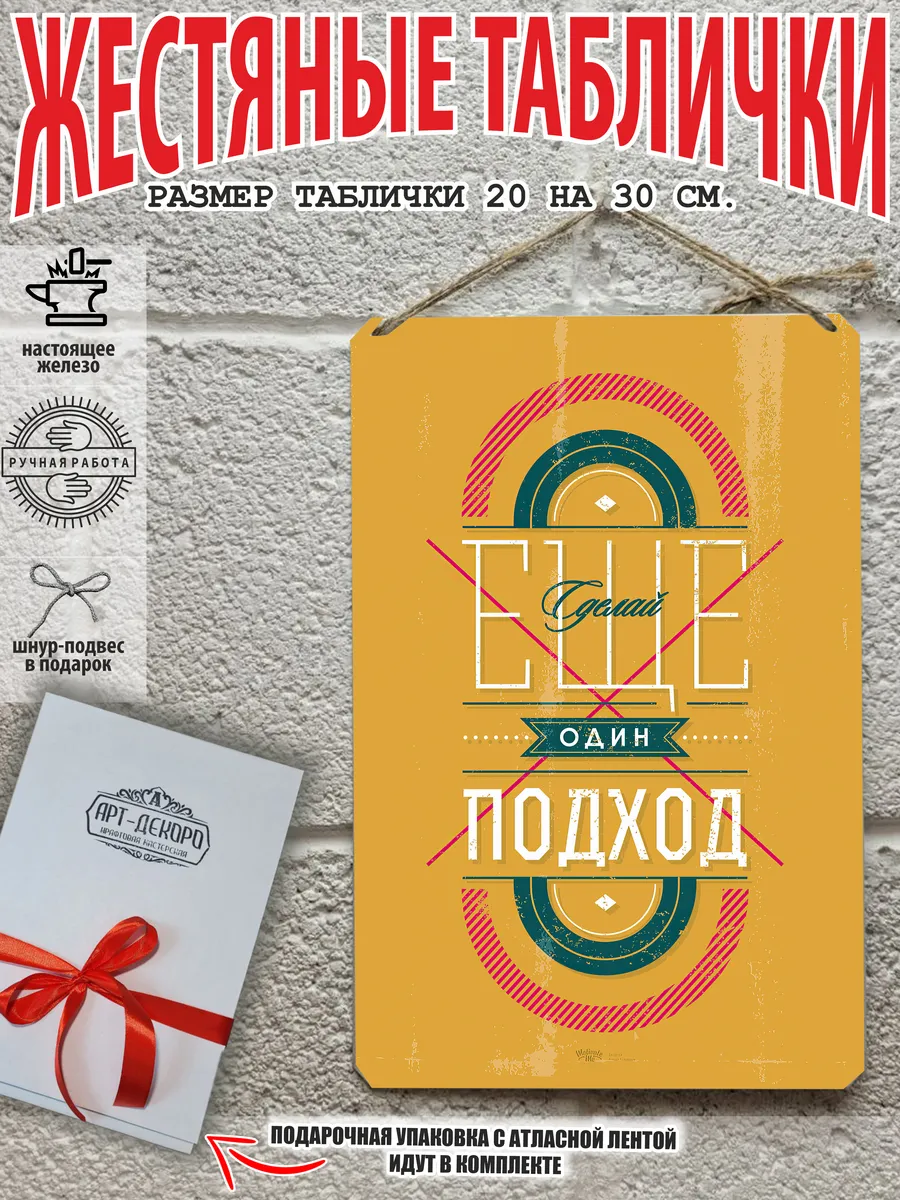 Обратите внимание! У нас все таблички идут сериями, можно создать отличную композицию в одном стиле. Кроме того, таблички это стильный и недорогой подарок по любому поводу. Прикольные штуки железная табличка картинки мотиваторы позитивные и демотиваторы из 100% металла от нашего бренда будет прекрасным украшением для квартиры, дома, офиса, бара или кафе. Мотивация это прикол, часть нашей жизни, картина мотиватор всегда улучшает настроение. Сочетая в себе эстетику и прочность, декоративная металлические мотивационные карточки являются непременным элементом декора как для внутренних помещений, так и для уличных зон. Выберите из нашего широкого ассортимента аксессуар, который подойдет именно вам. Жестяная табличка Арт-Декоро крепится на саморезы, шурупы или на специальный шнур из натурального джута который идет в комплекте с каждым заказом как бесплатный подарок, что позволяет разнообразить способы использования. Плакаты с приколами можно повесить на стену в гостиной, спальне, кухне или на улице, чтобы создать атмосферу, которая отражает индивидуальность. Таблички можно мыть, они не выцветают долгие годы. Картина открытки постер плакат стикеры наклейки приколы мотивация все это сочетается в наших изделиях. Мы гордимся тем, что каждое изделие изготовлено из настоящего металла, краска наносится прямо на железо. Это гарантирует ее долговечность и надежность. Красивая и изысканная отделка обеспечивает эффектный внешний вид и придает обстановке особое очарование. Подарите возможность добавить изюминку в интерьер и превратите пространство в уникальное, а также уютное место, которое будет отличаться от всех остальных. В нашем магазине Вы найдёте большой выбор декора интерьера и создадите превосходную обстановку.