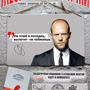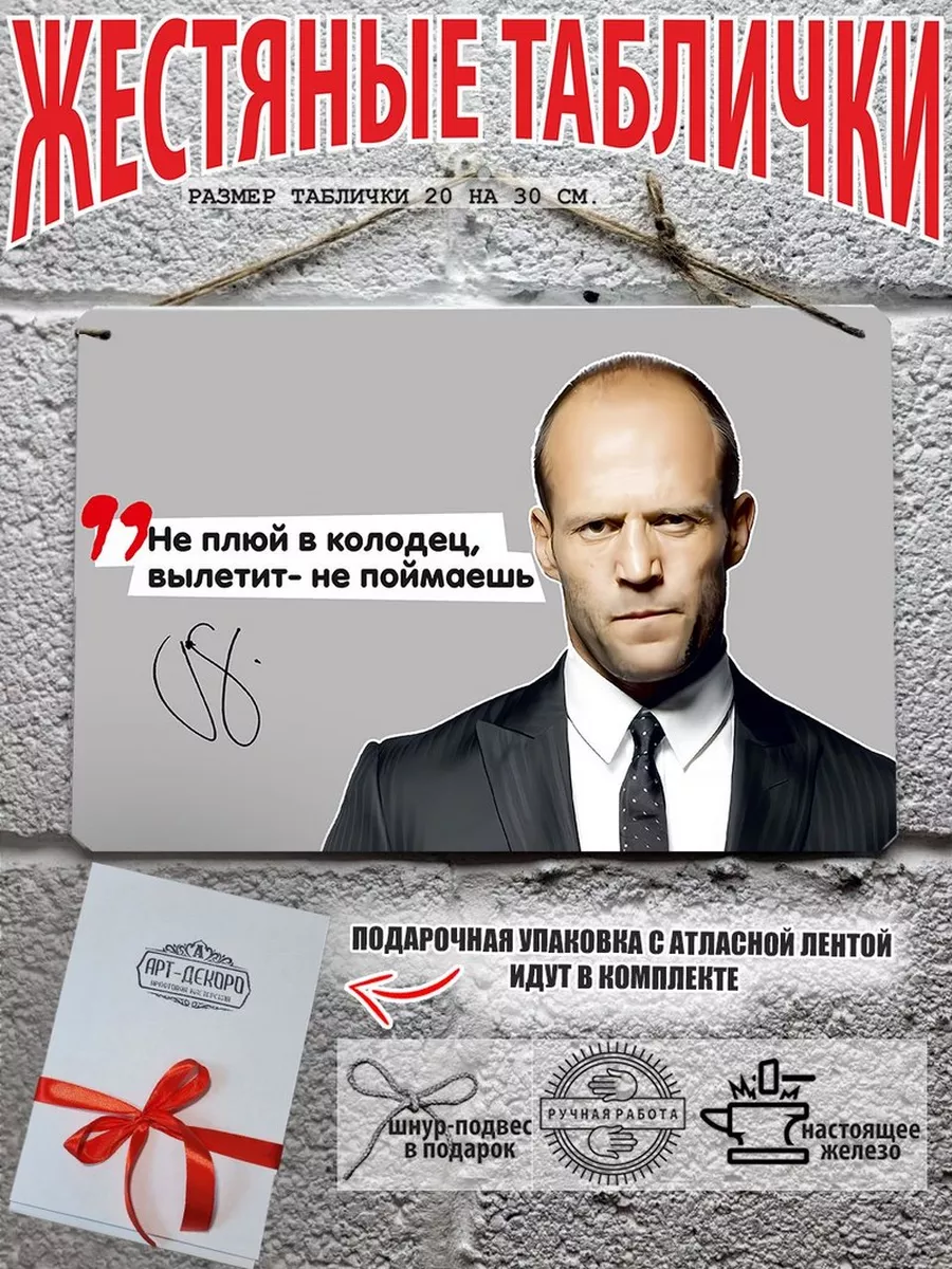 Выдуманные фразы Джейсона Стэтхэма на русском языке стали культом в интернете по всему миру. Мы предлагаем уникальный дизайн фото портрет Джейсон Стэтхэм автограф и цитата по любому случаю из 100% металла от нашего бренда будет прекрасным украшением для квартиры, дома, офиса, бара или кафе. Сочетая в себе эстетику и прочность, декоративная металлические таблички являются непременным элементом декора как для внутренних помещений, так и для уличных зон. Жестяная табличка от Арт-Декоро уникальный продукт от нашего дизайнера крепится на саморезы, шурупы или на специальный шнур из натурального джута который идет в комплекте с каждым заказом как бесплатный подарок, что позволяет разнообразить способы использования. Плакаты с приколами про Джейсона Стэтхема можно повесить на стену в гостиной, спальне, кухне или на улице, на работе в офисе, чтобы создать атмосферу, которая отражает вашу индивидуальность. Табличка с юмором Джейсон Стэтхэм упакована в подарочную упаковку — что делает ее готовым подарком по любому поводу. Таблички можно мыть, они не выцветают долгие годы. Мы гордимся тем, что каждое изделие изготовлено из настоящего металла, краска наносится прямо на железо. Это гарантирует ее долговечность и надежность. Красивая и изысканная отделка обеспечивает эффектный внешний вид и придает обстановке особое очарование. Джейсон Стэтхэм — серия табличек в едином стиле с разными выражениями позволдяет собрать коллекцию для создания уникального интерьера