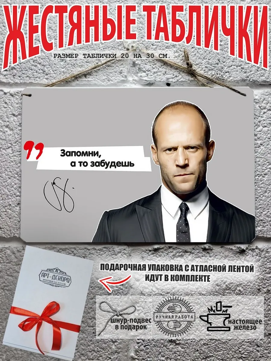Выдуманные фразы Джейсона Стэтхэма на русском языке стали культом в интернете по всему миру. Мы предлагаем уникальный дизайн фото портрет Джейсон Стэтхэм автограф и цитата по любому случаю из 100% металла от нашего бренда будет прекрасным украшением для квартиры, дома, офиса, бара или кафе. Сочетая в себе эстетику и прочность, декоративная металлические таблички являются непременным элементом декора как для внутренних помещений, так и для уличных зон. Жестяная табличка от Арт-Декоро уникальный продукт от нашего дизайнера крепится на саморезы, шурупы или на специальный шнур из натурального джута который идет в комплекте с каждым заказом как бесплатный подарок, что позволяет разнообразить способы использования. Плакаты с приколами про Джейсона Стэтхема можно повесить на стену в гостиной, спальне, кухне или на улице, на работе в офисе, чтобы создать атмосферу, которая отражает вашу индивидуальность. Табличка с юмором Джейсон Стэтхэм упакована в подарочную упаковку — что делает ее готовым подарком по любому поводу. Таблички можно мыть, они не выцветают долгие годы. Мы гордимся тем, что каждое изделие изготовлено из настоящего металла, краска наносится прямо на железо. Это гарантирует ее долговечность и надежность. Красивая и изысканная отделка обеспечивает эффектный внешний вид и придает обстановке особое очарование. Джейсон Стэтхэм — серия табличек в едином стиле с разными выражениями позволдяет собрать коллекцию для создания уникального интерьера