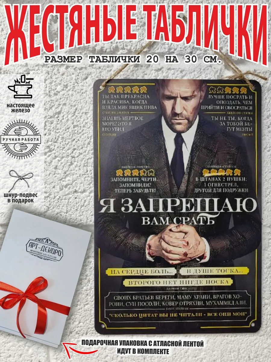 Обратите внимание! У нас все таблички идут сериями, можно создать отличную композицию в одном стиле. Кроме того, таблички это стильный и недорогой подарок по любому поводу. Прикольные штуки железная табличка картинки мотиваторы позитивные и демотиваторы из 100% металла от нашего бренда будет прекрасным украшением для квартиры, дома, офиса, бара или кафе. Мотивация это прикол, часть нашей жизни, картина мотиватор всегда улучшает настроение. Сочетая в себе эстетику и прочность, декоративная металлические мотивационные карточки являются непременным элементом декора как для внутренних помещений, так и для уличных зон. Выберите из нашего широкого ассортимента аксессуар, который подойдет именно вам. Жестяная табличка Арт-Декоро крепится на саморезы, шурупы или на специальный шнур из натурального джута который идет в комплекте с каждым заказом как бесплатный подарок, что позволяет разнообразить способы использования. Плакаты с приколами можно повесить на стену в гостиной, спальне, кухне или на улице, чтобы создать атмосферу, которая отражает индивидуальность. Таблички можно мыть, они не выцветают долгие годы. Картина открытки постер плакат стикеры наклейки приколы мотивация все это сочетается в наших изделиях. Мы гордимся тем, что каждое изделие изготовлено из настоящего металла, краска наносится прямо на железо. Это гарантирует ее долговечность и надежность. Красивая и изысканная отделка обеспечивает эффектный внешний вид и придает обстановке особое очарование. Подарите возможность добавить изюминку в интерьер и превратите пространство в уникальное, а также уютное место, которое будет отличаться от всех остальных. В нашем магазине Вы найдёте большой выбор декора интерьера и создадите превосходную обстановку.
