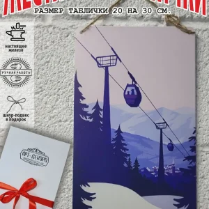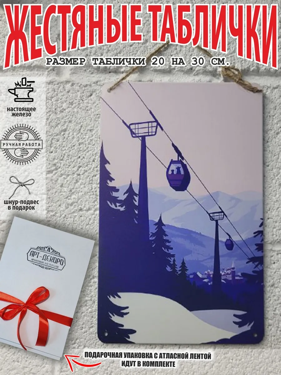Постер «Канатная дорога» станет стильным и оригинальным украшением для вашей стены. Изготовленная из металла табличка с изображением канатной дороги в горах добавит нотку приключений и путешествий в любой интерьер. Благодаря прямоугольной форме и удобному шнуру-подвесу из натурального джута, постер легко крепится на стену. Он станет отличным подарком для любителей активного отдыха и путешествий, а также украсит гараж, дачу или офис.