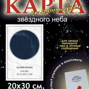 Всё продумано до мелочей. Человек, которому вы подарите индивидуальную карту звездного неба по его дате рождения будет точно удивлен. На постер будет указана дата, время, а так же город и милая надпись. Такой постер станет отличным подарком для друзей, родных или даже для вас самих. Он поможет выразить свои чувства и напомнить о счастливых моментах. Удивите своих близких этой нестандартной и трогательной идеей, которая будет вызывать только положительные эмоции.