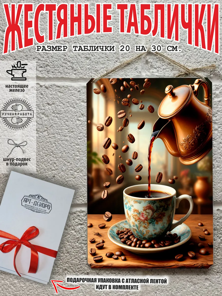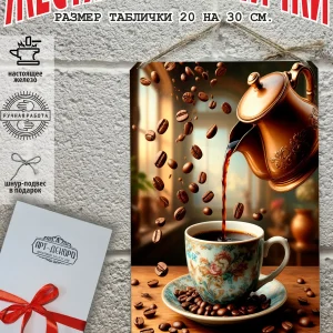Металлическая табличка для интерьера кофе из 100% металла, размером 20 на 30 см. Если вы хотите порадовать своих себя или своих близких, то вам не придется думать над упаковкой, так как наши таблички кофе поставляются в подарочной упаковке с атласной лентой и открыткой. Это готовый недорогой подарок на все случаи жизни.