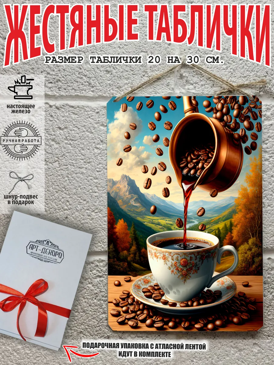 Металлическая табличка для интерьера кофе из 100% металла, размером 20 на 30 см. Если вы хотите порадовать своих себя или своих близких, то вам не придется думать над упаковкой, так как наши таблички кофе поставляются в подарочной упаковке с атласной лентой и открыткой. Это готовый недорогой подарок на все случаи жизни.