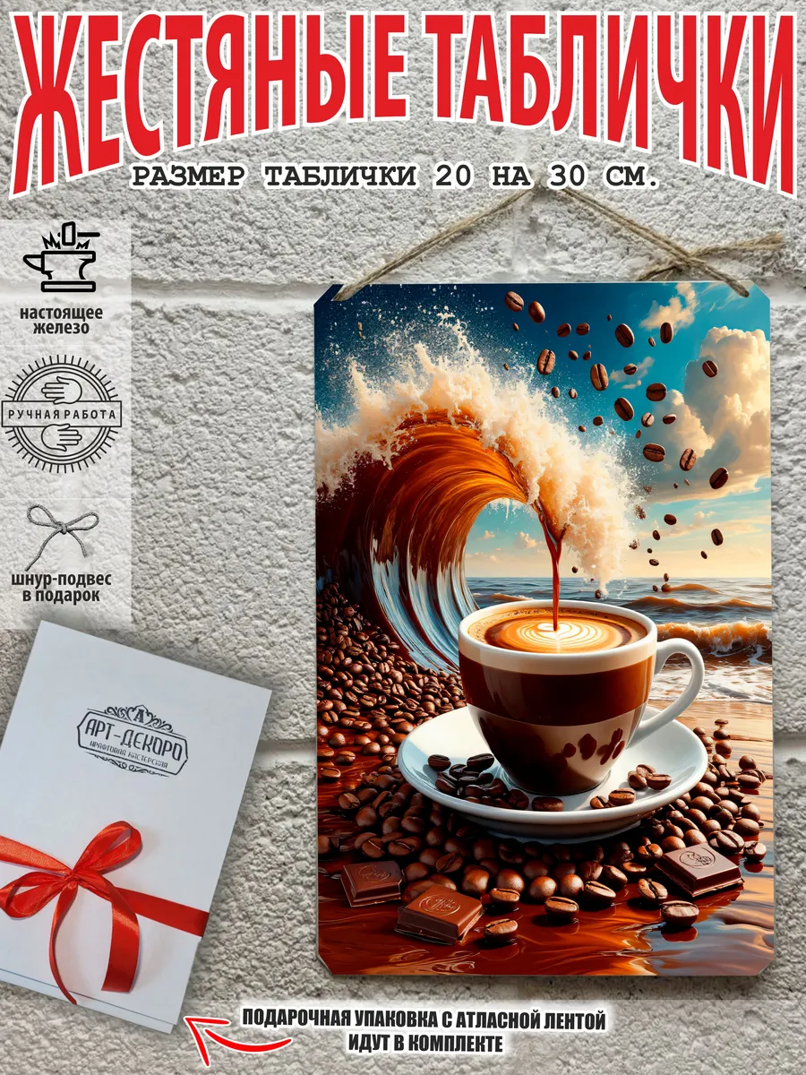 Металлическая табличка для интерьера кофе из 100% металла, размером 20 на 30 см. Если вы хотите порадовать своих себя или своих близких, то вам не придется думать над упаковкой, так как наши таблички кофе поставляются в подарочной упаковке с атласной лентой и открыткой. Это готовый недорогой подарок на все случаи жизни.