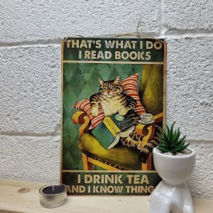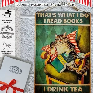 кот читает книгу и пьет чай