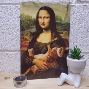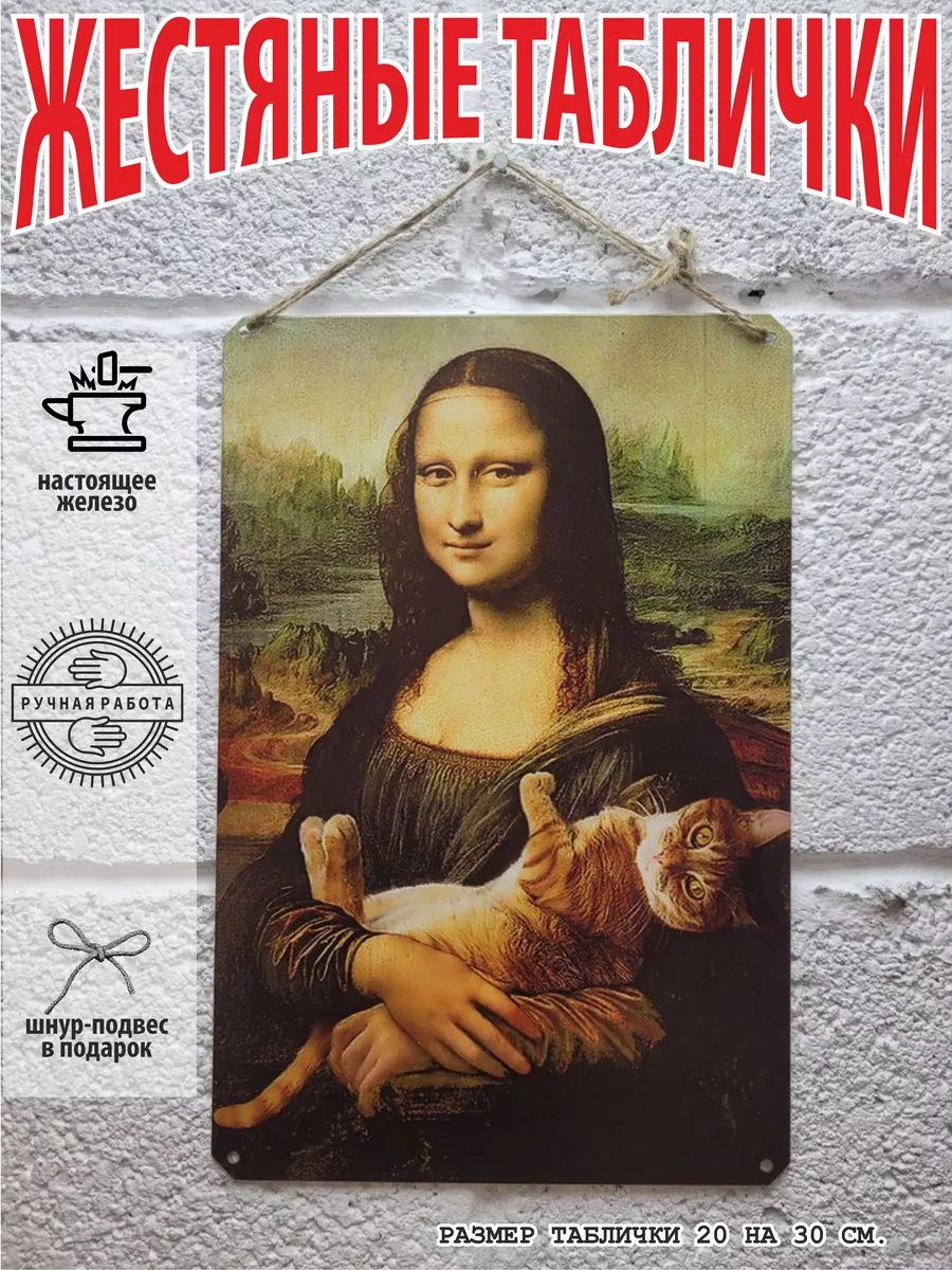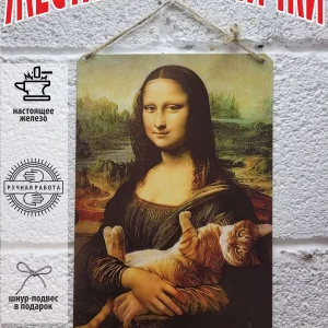 Постер «Кот и Мона Лиза» — оригинальный способ украсить интерьер и добавить нотку юмора в ваш дом. Этот металлический постер, выполненный в стиле знаменитой картины да Винчи, станет стильным акцентом в любой комнате. Изображение милого кота и Моны Лизы вызовет улыбку у вас и ваших гостей. Постер поставляется с удобным шнуром-подвесом из натурального джута и упакован в экологичную картонную коробку, что делает его отличным подарком для любителей кошек и ценителей искусства.