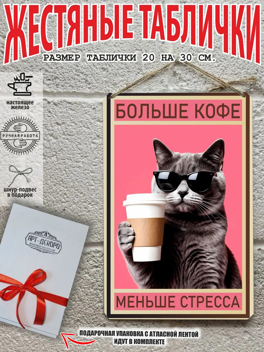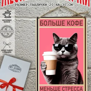 Металлическая табличка для интерьера кофе из 100% металла, размером 20 на 30 см. Если вы хотите порадовать своих себя или своих близких, то вам не придется думать над упаковкой, так как наши таблички кофе поставляются в подарочной упаковке с атласной лентой и открыткой. Это готовый недорогой подарок на все случаи жизни.