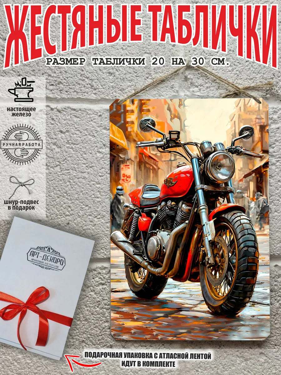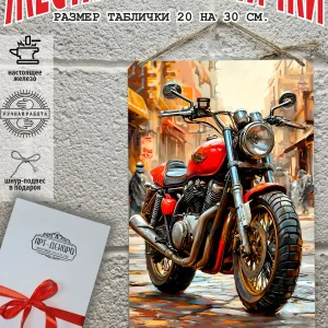 Декоративная табличка «Мотоцикл» от бренда МОТОтематика станет стильным украшением интерьера для настоящих ценителей двухколесной техники. Изготовленная из прочного металла, табличка имеет прямоугольную форму и оснащена удобным шнуром-подвесом из натурального джута. Табличка поставляется в эко-упаковке из картона, что делает ее идеальным подарком для друзей и близких, увлеченных мотоциклами. Прикрепите ее на стену в гараже, гостиной или на кухне, чтобы добавить интерьеру уникальный штрих. Уникальный авторский дизайн от нашего нейрохудожника.