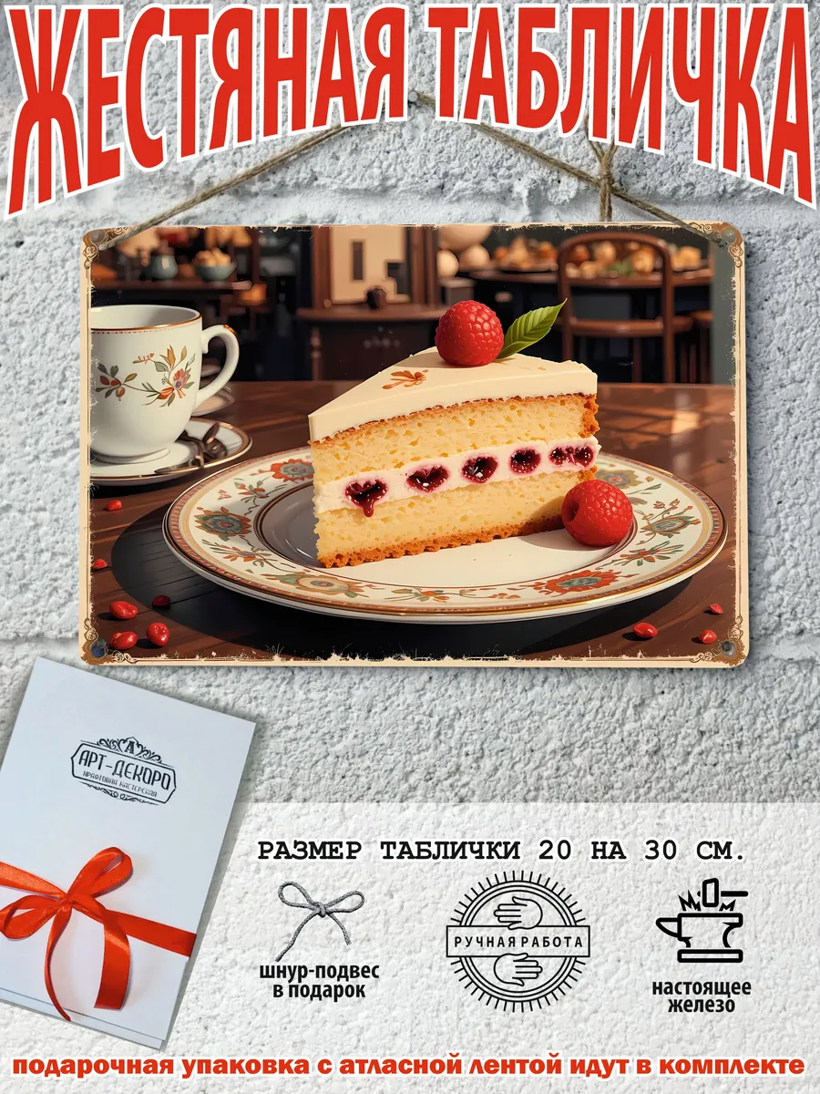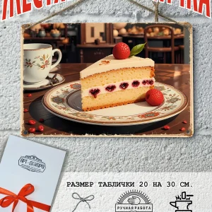 Интерьерная жестяная картина на стену с изображением десертов выполненная из 100% металла станет отличный подарком на кухню, и также украсит рестораны и кафе. Постер с приготовленным ароматным блюдом крепится на саморезы-шурупы, в табличке по углам имеются отверстия или на шнур-подвес из натурального джута, который идёт в подарок.