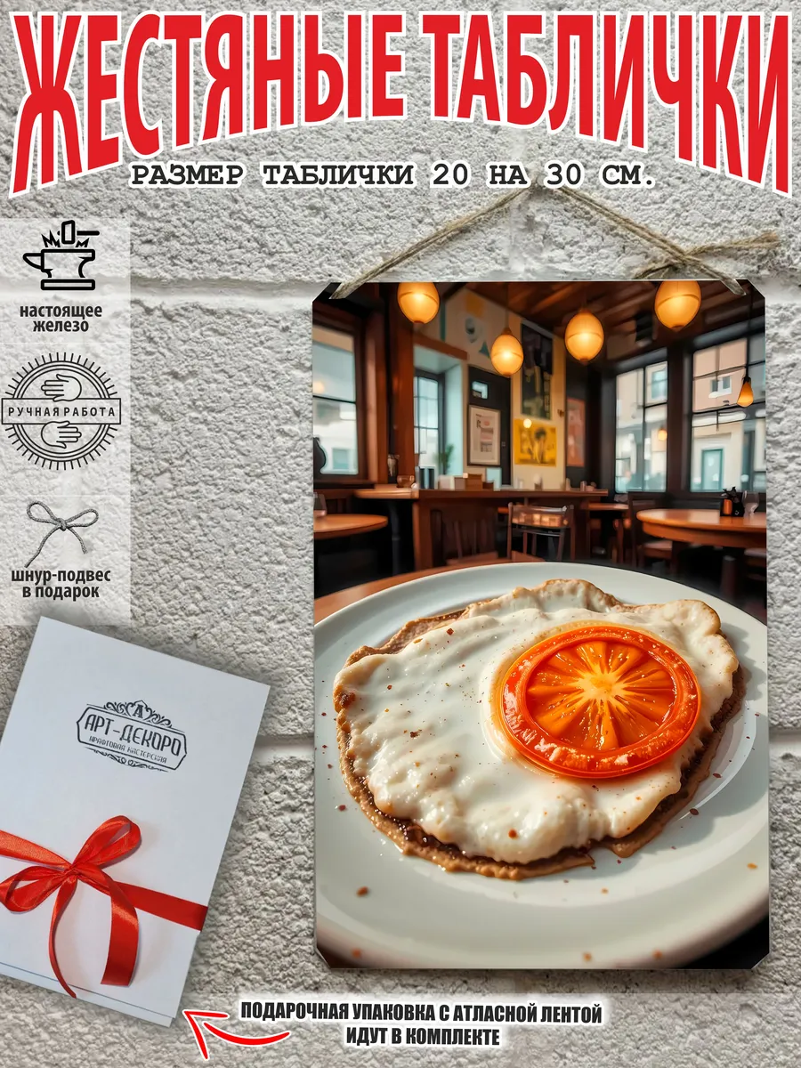 Интерьерная жестяная картина на стену с изображением десертов выполненная из 100% металла станет отличный подарком на кухню, и также украсит рестораны и кафе. Постер с приготовленным ароматным блюдом крепится на саморезы-шурупы, в табличке по углам имеются отверстия или на шнур-подвес из натурального джута, который идёт в подарок.