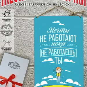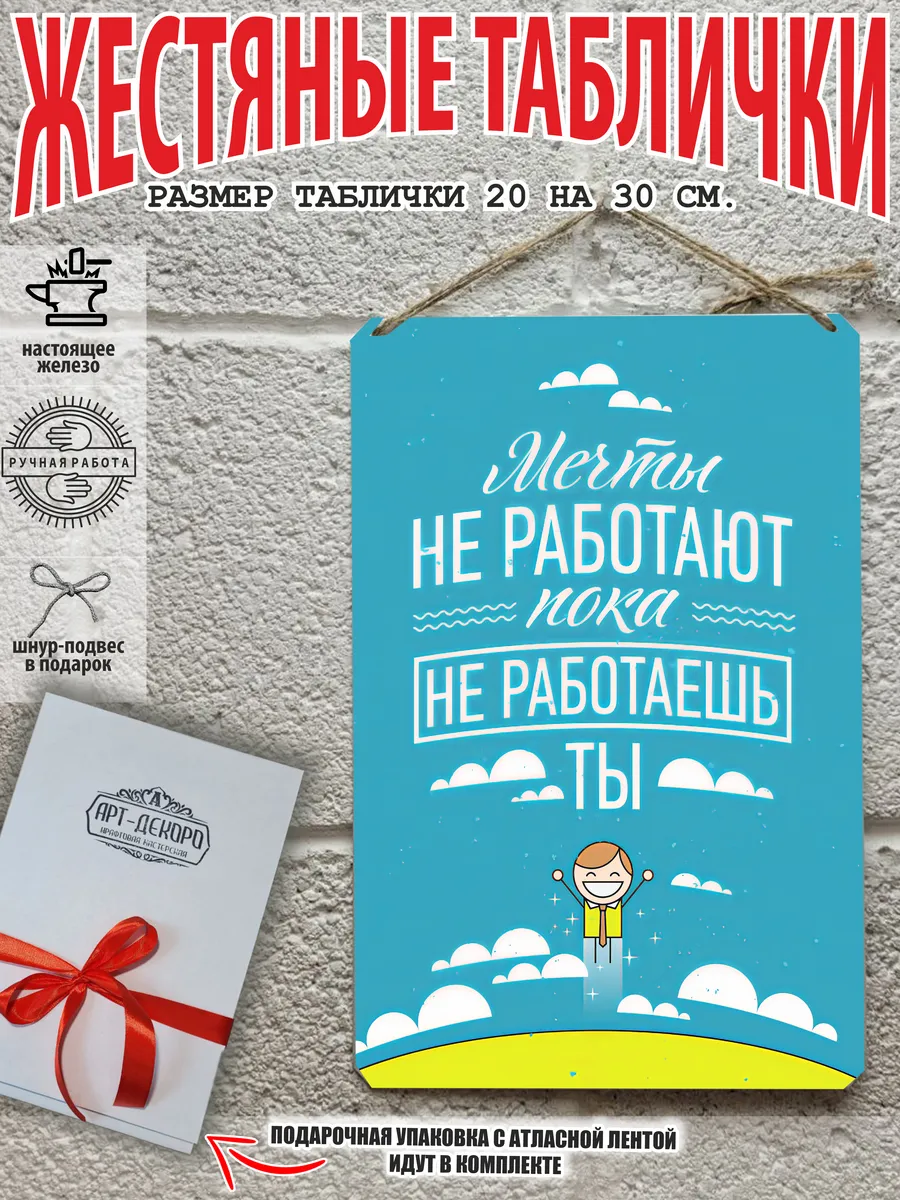 Обратите внимание! У нас все таблички идут сериями, можно создать отличную композицию в одном стиле. Кроме того, таблички это стильный и недорогой подарок по любому поводу. Прикольные штуки железная табличка картинки мотиваторы позитивные и демотиваторы из 100% металла от нашего бренда будет прекрасным украшением для квартиры, дома, офиса, бара или кафе. Мотивация это прикол, часть нашей жизни, картина мотиватор всегда улучшает настроение. Сочетая в себе эстетику и прочность, декоративная металлические мотивационные карточки являются непременным элементом декора как для внутренних помещений, так и для уличных зон. Выберите из нашего широкого ассортимента аксессуар, который подойдет именно вам. Жестяная табличка Арт-Декоро крепится на саморезы, шурупы или на специальный шнур из натурального джута который идет в комплекте с каждым заказом как бесплатный подарок, что позволяет разнообразить способы использования. Плакаты с приколами можно повесить на стену в гостиной, спальне, кухне или на улице, чтобы создать атмосферу, которая отражает индивидуальность. Таблички можно мыть, они не выцветают долгие годы. Картина открытки постер плакат стикеры наклейки приколы мотивация все это сочетается в наших изделиях. Мы гордимся тем, что каждое изделие изготовлено из настоящего металла, краска наносится прямо на железо. Это гарантирует ее долговечность и надежность. Красивая и изысканная отделка обеспечивает эффектный внешний вид и придает обстановке особое очарование. Подарите возможность добавить изюминку в интерьер и превратите пространство в уникальное, а также уютное место, которое будет отличаться от всех остальных. В нашем магазине Вы найдёте большой выбор декора интерьера и создадите превосходную обстановку.