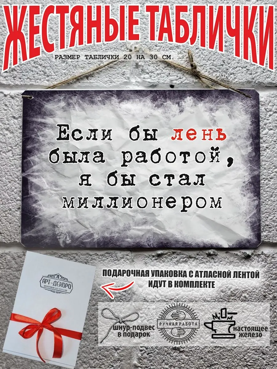 Обратите внимание! У нас все таблички идут сериями, можно создать отличную композицию в одном стиле. Кроме того, таблички это стильный и недорогой подарок по любому поводу. Прикольные штуки железная табличка картинки мотиваторы позитивные и демотиваторы из 100% металла от нашего бренда будет прекрасным украшением для квартиры, дома, офиса, бара или кафе. Мотивация это прикол, часть нашей жизни, картина мотиватор всегда улучшает настроение. Сочетая в себе эстетику и прочность, декоративная металлические мотивационные карточки являются непременным элементом декора как для внутренних помещений, так и для уличных зон. Выберите из нашего широкого ассортимента аксессуар, который подойдет именно вам. Жестяная табличка Арт-Декоро крепится на саморезы, шурупы или на специальный шнур из натурального джута который идет в комплекте с каждым заказом как бесплатный подарок, что позволяет разнообразить способы использования. Плакаты с приколами можно повесить на стену в гостиной, спальне, кухне или на улице, чтобы создать атмосферу, которая отражает индивидуальность. Таблички можно мыть, они не выцветают долгие годы. Картина открытки постер плакат стикеры наклейки приколы мотивация все это сочетается в наших изделиях. Мы гордимся тем, что каждое изделие изготовлено из настоящего металла, краска наносится прямо на железо. Это гарантирует ее долговечность и надежность. Красивая и изысканная отделка обеспечивает эффектный внешний вид и придает обстановке особое очарование. Подарите возможность добавить изюминку в интерьер и превратите пространство в уникальное, а также уютное место, которое будет отличаться от всех остальных. В нашем магазине Вы найдёте большой выбор декора интерьера и создадите превосходную обстановку.