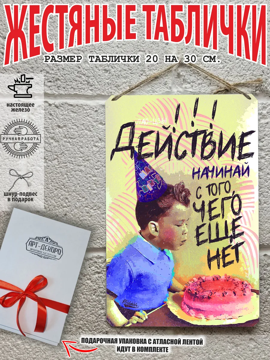Обратите внимание! У нас все таблички идут сериями, можно создать отличную композицию в одном стиле. Кроме того, таблички это стильный и недорогой подарок по любому поводу. Прикольные штуки железная табличка картинки мотиваторы позитивные и демотиваторы из 100% металла от нашего бренда будет прекрасным украшением для квартиры, дома, офиса, бара или кафе. Мотивация это прикол, часть нашей жизни, картина мотиватор всегда улучшает настроение. Сочетая в себе эстетику и прочность, декоративная металлические мотивационные карточки являются непременным элементом декора как для внутренних помещений, так и для уличных зон. Выберите из нашего широкого ассортимента аксессуар, который подойдет именно вам. Жестяная табличка Арт-Декоро крепится на саморезы, шурупы или на специальный шнур из натурального джута который идет в комплекте с каждым заказом как бесплатный подарок, что позволяет разнообразить способы использования. Плакаты с приколами можно повесить на стену в гостиной, спальне, кухне или на улице, чтобы создать атмосферу, которая отражает индивидуальность. Таблички можно мыть, они не выцветают долгие годы. Картина открытки постер плакат стикеры наклейки приколы мотивация все это сочетается в наших изделиях. Мы гордимся тем, что каждое изделие изготовлено из настоящего металла, краска наносится прямо на железо. Это гарантирует ее долговечность и надежность. Красивая и изысканная отделка обеспечивает эффектный внешний вид и придает обстановке особое очарование. Подарите возможность добавить изюминку в интерьер и превратите пространство в уникальное, а также уютное место, которое будет отличаться от всех остальных. В нашем магазине Вы найдёте большой выбор декора интерьера и создадите превосходную обстановку.