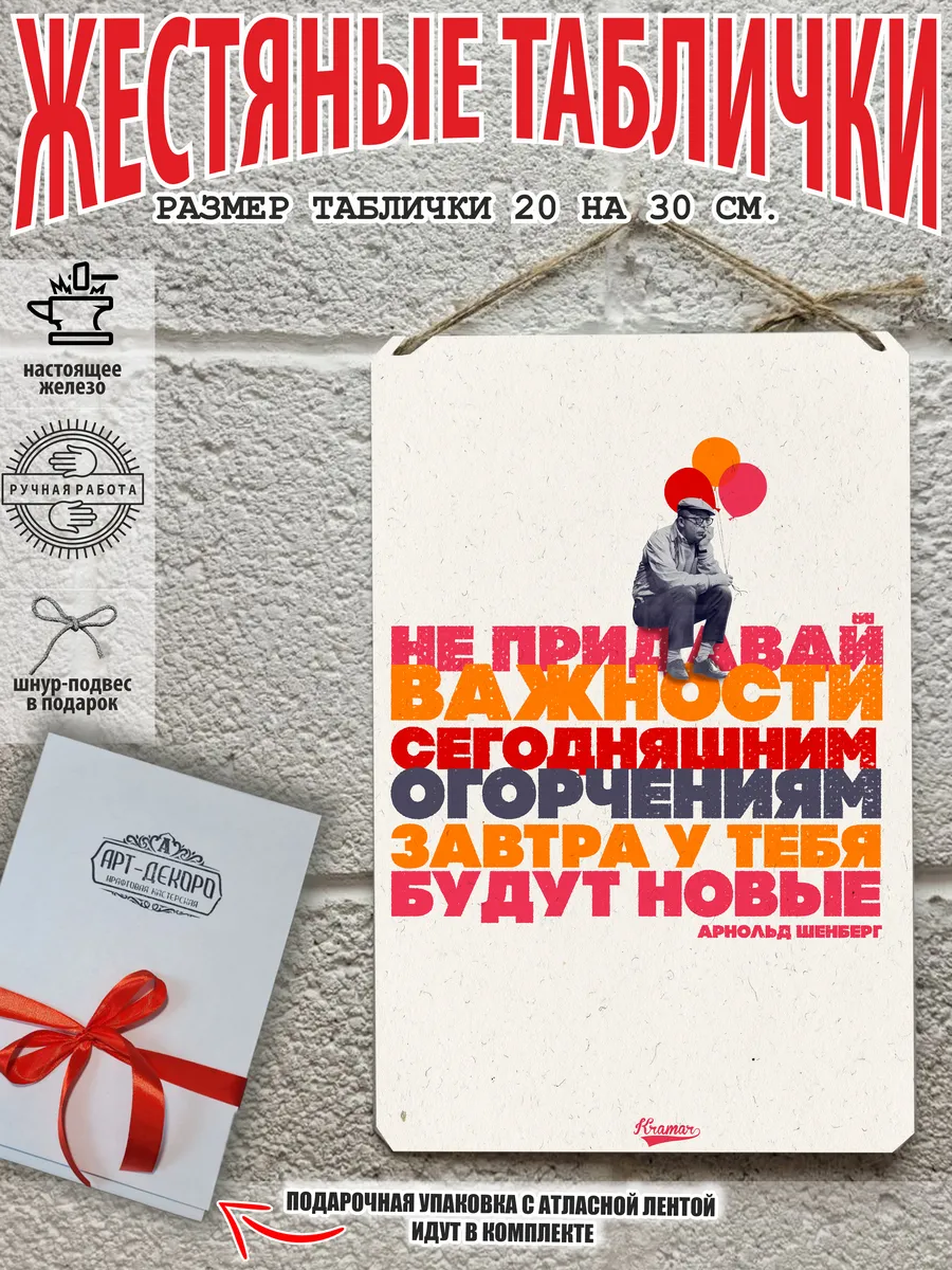 Обратите внимание! У нас все таблички идут сериями, можно создать отличную композицию в одном стиле. Кроме того, таблички это стильный и недорогой подарок по любому поводу. Прикольные штуки железная табличка картинки мотиваторы позитивные и демотиваторы из 100% металла от нашего бренда будет прекрасным украшением для квартиры, дома, офиса, бара или кафе. Мотивация это прикол, часть нашей жизни, картина мотиватор всегда улучшает настроение. Сочетая в себе эстетику и прочность, декоративная металлические мотивационные карточки являются непременным элементом декора как для внутренних помещений, так и для уличных зон. Выберите из нашего широкого ассортимента аксессуар, который подойдет именно вам. Жестяная табличка Арт-Декоро крепится на саморезы, шурупы или на специальный шнур из натурального джута который идет в комплекте с каждым заказом как бесплатный подарок, что позволяет разнообразить способы использования. Плакаты с приколами можно повесить на стену в гостиной, спальне, кухне или на улице, чтобы создать атмосферу, которая отражает индивидуальность. Таблички можно мыть, они не выцветают долгие годы. Картина открытки постер плакат стикеры наклейки приколы мотивация все это сочетается в наших изделиях. Мы гордимся тем, что каждое изделие изготовлено из настоящего металла, краска наносится прямо на железо. Это гарантирует ее долговечность и надежность. Красивая и изысканная отделка обеспечивает эффектный внешний вид и придает обстановке особое очарование. Подарите возможность добавить изюминку в интерьер и превратите пространство в уникальное, а также уютное место, которое будет отличаться от всех остальных. В нашем магазине Вы найдёте большой выбор декора интерьера и создадите превосходную обстановку.