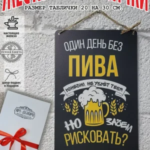 Постер «Один день пива конечно тебя не убьет, но зачем рисковать?» — стильное украшение для любителей пива и ретро-дизайна. Изготовленный из прочного металла, постер с изображением пива станет ярким акцентом в интерьере бара, кухни или гостиной. Его можно повесить на стену с помощью прилагаемого шнура из натурального джута, который придает изделию rustic-стиль. Постер упакован в экологичную картонную коробку, что делает его готовым подарком для друзей и близких.