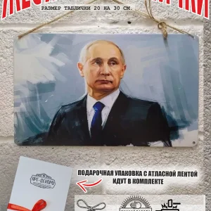 Декоративная табличка картина с портретом Владимира Владимировича Путина станет оригинальным украшением вашего интерьера или прекрасным подарком для ценителей истории и политики. Изготовленная из прочного металла, табличка 20 на 30 см. имеет прямоугольную форму и оснащена шнуром-подвесом для удобного размещения на стене. Табличка упакована в подарочную упаковку, что делает ее еще более привлекательным презентом.