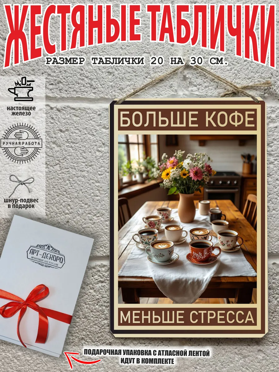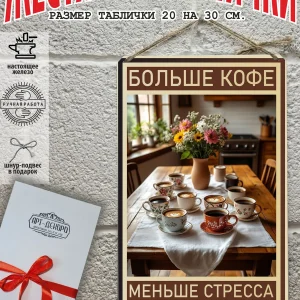 Металлическая табличка для интерьера кофе из 100% металла, размером 20 на 30 см. Если вы хотите порадовать своих себя или своих близких, то вам не придется думать над упаковкой, так как наши таблички кофе поставляются в подарочной упаковке с атласной лентой и открыткой. Это готовый недорогой подарок на все случаи жизни.