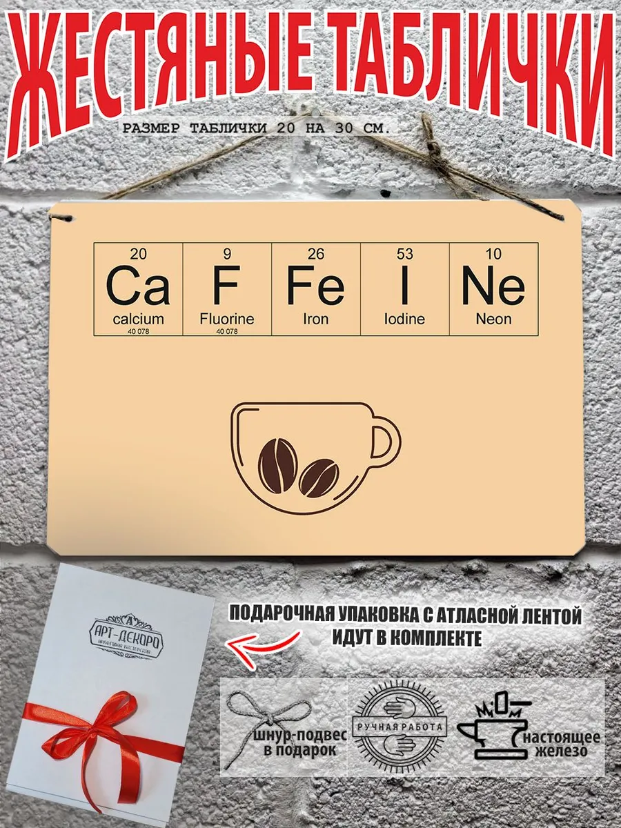 Металлическая табличка для интерьера кофе из 100% металла, размером 20 на 30 см. Если вы хотите порадовать своих себя или своих близких, то вам не придется думать над упаковкой, так как наши таблички кофе поставляются в подарочной упаковке с атласной лентой и открыткой. Это готовый недорогой подарок на все случаи жизни.