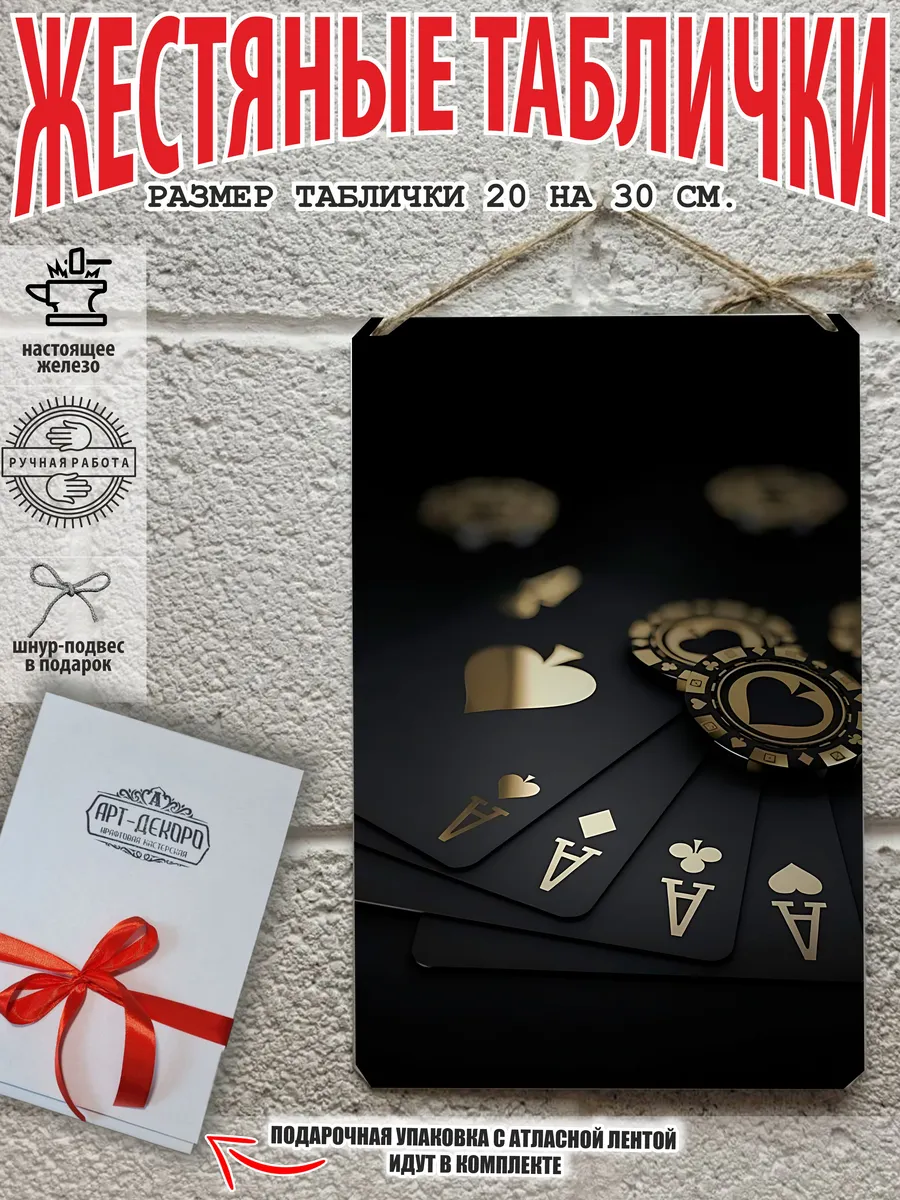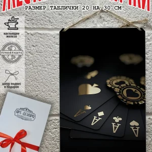 Представляем вам стильные и эффектные жестяные таблички с изображением игральных карт. Наши постеры — жестяные таблички покер, выполнены из металла, который отличается высоким качеством и долговечностью. Размер 20×30 см позволяет легко вписать наши картины в любой интерьер, будь то кухня, гостиная, офис или кафе. Почему стоит выбрать наш постер для интерьера? Яркие и насыщенные цвета не выгорают на солнце и делают ваше пространство выразительным и уникальным. Легкость в уходе: наши картины для интерьера, таблички блэк-джек покер мафия и постеры на стену виски и сигара можно легко мыть. Они не боятся влаги, что позволяет использовать их как в помещениях, так и на улице. Удобные варианты крепления: табличка может быть установлена на саморезы, гвозди, кнопки, клейкую ленту, магниты или повешена на шнур из натурального джута, который идет в комплекте. Упаковка: каждая табличка карта туз пики фэнтези красивые игральные карты колода казино аккуратно упакована в защитный пакет и дополнительно завернута в эко-картон, а также дополнительно в комплекте идет подарочная упаковка, атласная лента и открытка — что делает её отличным подарком на любой случай – от дня рождения до новоселья – готовый подарок. Мы гордимся тем, что предлагаем более 15 000 уникальных дизайнов, включая постеры на стену для интерьера, постер на заказ карты bicycle и прикольные металлические таблички, чтобы каждый мог найти что-то для себя. Наши постеры разделены на коллекции разных серий, что позволяет заказать несколько табличек в едином стиле и создать неповторимую композицию у вас дома, не упустите возможность сделать свой дом стильным – добавляйте товары в избранное, чтобы первыми узнавать о скидках и новинках! Создайте атмосферу уюта и стиля с нашими металлическими картинами и постерами для интерьера уже сегодня!