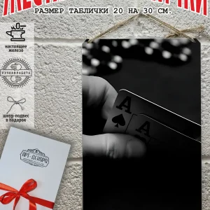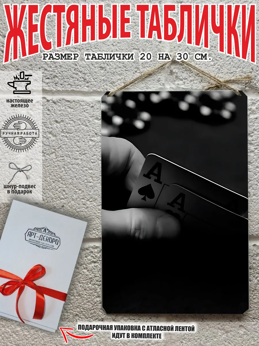 Представляем вам стильные и эффектные жестяные таблички с изображением игральных карт. Наши постеры — жестяные таблички покер, выполнены из металла, который отличается высоким качеством и долговечностью. Размер 20×30 см позволяет легко вписать наши картины в любой интерьер, будь то кухня, гостиная, офис или кафе. Почему стоит выбрать наш постер для интерьера? Яркие и насыщенные цвета не выгорают на солнце и делают ваше пространство выразительным и уникальным. Легкость в уходе: наши картины для интерьера, таблички блэк-джек покер мафия и постеры на стену виски и сигара можно легко мыть. Они не боятся влаги, что позволяет использовать их как в помещениях, так и на улице. Удобные варианты крепления: табличка может быть установлена на саморезы, гвозди, кнопки, клейкую ленту, магниты или повешена на шнур из натурального джута, который идет в комплекте. Упаковка: каждая табличка карта туз пики фэнтези красивые игральные карты колода казино аккуратно упакована в защитный пакет и дополнительно завернута в эко-картон, а также дополнительно в комплекте идет подарочная упаковка, атласная лента и открытка — что делает её отличным подарком на любой случай – от дня рождения до новоселья – готовый подарок. Мы гордимся тем, что предлагаем более 15 000 уникальных дизайнов, включая постеры на стену для интерьера, постер на заказ карты bicycle и прикольные металлические таблички, чтобы каждый мог найти что-то для себя. Наши постеры разделены на коллекции разных серий, что позволяет заказать несколько табличек в едином стиле и создать неповторимую композицию у вас дома, не упустите возможность сделать свой дом стильным – добавляйте товары в избранное, чтобы первыми узнавать о скидках и новинках! Создайте атмосферу уюта и стиля с нашими металлическими картинами и постерами для интерьера уже сегодня!