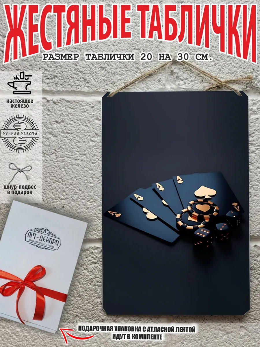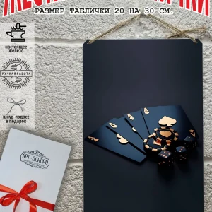 Представляем вам стильные и эффектные жестяные таблички с изображением игральных карт. Наши постеры — жестяные таблички покер, выполнены из металла, который отличается высоким качеством и долговечностью. Размер 20×30 см позволяет легко вписать наши картины в любой интерьер, будь то кухня, гостиная, офис или кафе. Почему стоит выбрать наш постер для интерьера? Яркие и насыщенные цвета не выгорают на солнце и делают ваше пространство выразительным и уникальным. Легкость в уходе: наши картины для интерьера, таблички блэк-джек покер мафия и постеры на стену виски и сигара можно легко мыть. Они не боятся влаги, что позволяет использовать их как в помещениях, так и на улице. Удобные варианты крепления: табличка может быть установлена на саморезы, гвозди, кнопки, клейкую ленту, магниты или повешена на шнур из натурального джута, который идет в комплекте. Упаковка: каждая табличка карта туз пики фэнтези красивые игральные карты колода казино аккуратно упакована в защитный пакет и дополнительно завернута в эко-картон, а также дополнительно в комплекте идет подарочная упаковка, атласная лента и открытка — что делает её отличным подарком на любой случай – от дня рождения до новоселья – готовый подарок. Мы гордимся тем, что предлагаем более 15 000 уникальных дизайнов, включая постеры на стену для интерьера, постер на заказ карты bicycle и прикольные металлические таблички, чтобы каждый мог найти что-то для себя. Наши постеры разделены на коллекции разных серий, что позволяет заказать несколько табличек в едином стиле и создать неповторимую композицию у вас дома, не упустите возможность сделать свой дом стильным – добавляйте товары в избранное, чтобы первыми узнавать о скидках и новинках! Создайте атмосферу уюта и стиля с нашими металлическими картинами и постерами для интерьера уже сегодня!