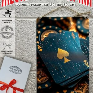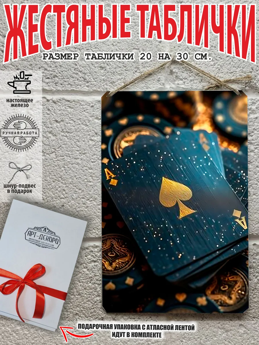 Представляем вам стильные и эффектные жестяные таблички с изображением игральных карт. Наши постеры — жестяные таблички покер, выполнены из металла, который отличается высоким качеством и долговечностью. Размер 20×30 см позволяет легко вписать наши картины в любой интерьер, будь то кухня, гостиная, офис или кафе. Почему стоит выбрать наш постер для интерьера? Яркие и насыщенные цвета не выгорают на солнце и делают ваше пространство выразительным и уникальным. Легкость в уходе: наши картины для интерьера, таблички блэк-джек покер мафия и постеры на стену виски и сигара можно легко мыть. Они не боятся влаги, что позволяет использовать их как в помещениях, так и на улице. Удобные варианты крепления: табличка может быть установлена на саморезы, гвозди, кнопки, клейкую ленту, магниты или повешена на шнур из натурального джута, который идет в комплекте. Упаковка: каждая табличка карта туз пики фэнтези красивые игральные карты колода казино аккуратно упакована в защитный пакет и дополнительно завернута в эко-картон, а также дополнительно в комплекте идет подарочная упаковка, атласная лента и открытка — что делает её отличным подарком на любой случай – от дня рождения до новоселья – готовый подарок. Мы гордимся тем, что предлагаем более 15 000 уникальных дизайнов, включая постеры на стену для интерьера, постер на заказ карты bicycle и прикольные металлические таблички, чтобы каждый мог найти что-то для себя. Наши постеры разделены на коллекции разных серий, что позволяет заказать несколько табличек в едином стиле и создать неповторимую композицию у вас дома, не упустите возможность сделать свой дом стильным – добавляйте товары в избранное, чтобы первыми узнавать о скидках и новинках! Создайте атмосферу уюта и стиля с нашими металлическими картинами и постерами для интерьера уже сегодня!