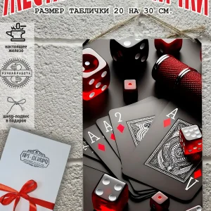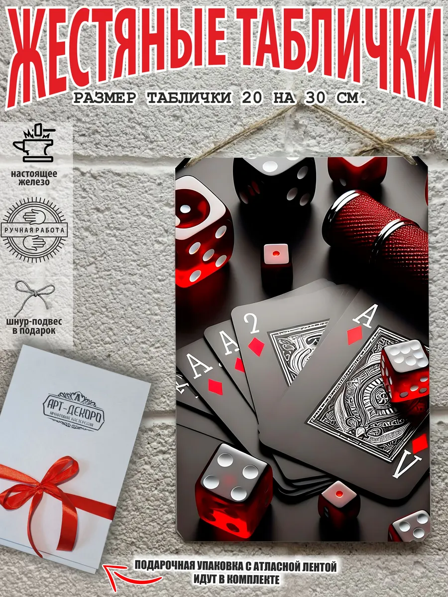 Представляем вам стильные и эффектные жестяные таблички с изображением игральных карт. Наши постеры — жестяные таблички покер, выполнены из металла, который отличается высоким качеством и долговечностью. Размер 20×30 см позволяет легко вписать наши картины в любой интерьер, будь то кухня, гостиная, офис или кафе. Почему стоит выбрать наш постер для интерьера? Яркие и насыщенные цвета не выгорают на солнце и делают ваше пространство выразительным и уникальным. Легкость в уходе: наши картины для интерьера, таблички блэк-джек покер мафия и постеры на стену виски и сигара можно легко мыть. Они не боятся влаги, что позволяет использовать их как в помещениях, так и на улице. Удобные варианты крепления: табличка может быть установлена на саморезы, гвозди, кнопки, клейкую ленту, магниты или повешена на шнур из натурального джута, который идет в комплекте. Упаковка: каждая табличка карта туз пики фэнтези красивые игральные карты колода казино аккуратно упакована в защитный пакет и дополнительно завернута в эко-картон, а также дополнительно в комплекте идет подарочная упаковка, атласная лента и открытка — что делает её отличным подарком на любой случай – от дня рождения до новоселья – готовый подарок. Мы гордимся тем, что предлагаем более 15 000 уникальных дизайнов, включая постеры на стену для интерьера, постер на заказ карты bicycle и прикольные металлические таблички, чтобы каждый мог найти что-то для себя. Наши постеры разделены на коллекции разных серий, что позволяет заказать несколько табличек в едином стиле и создать неповторимую композицию у вас дома, не упустите возможность сделать свой дом стильным – добавляйте товары в избранное, чтобы первыми узнавать о скидках и новинках! Создайте атмосферу уюта и стиля с нашими металлическими картинами и постерами для интерьера уже сегодня!