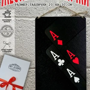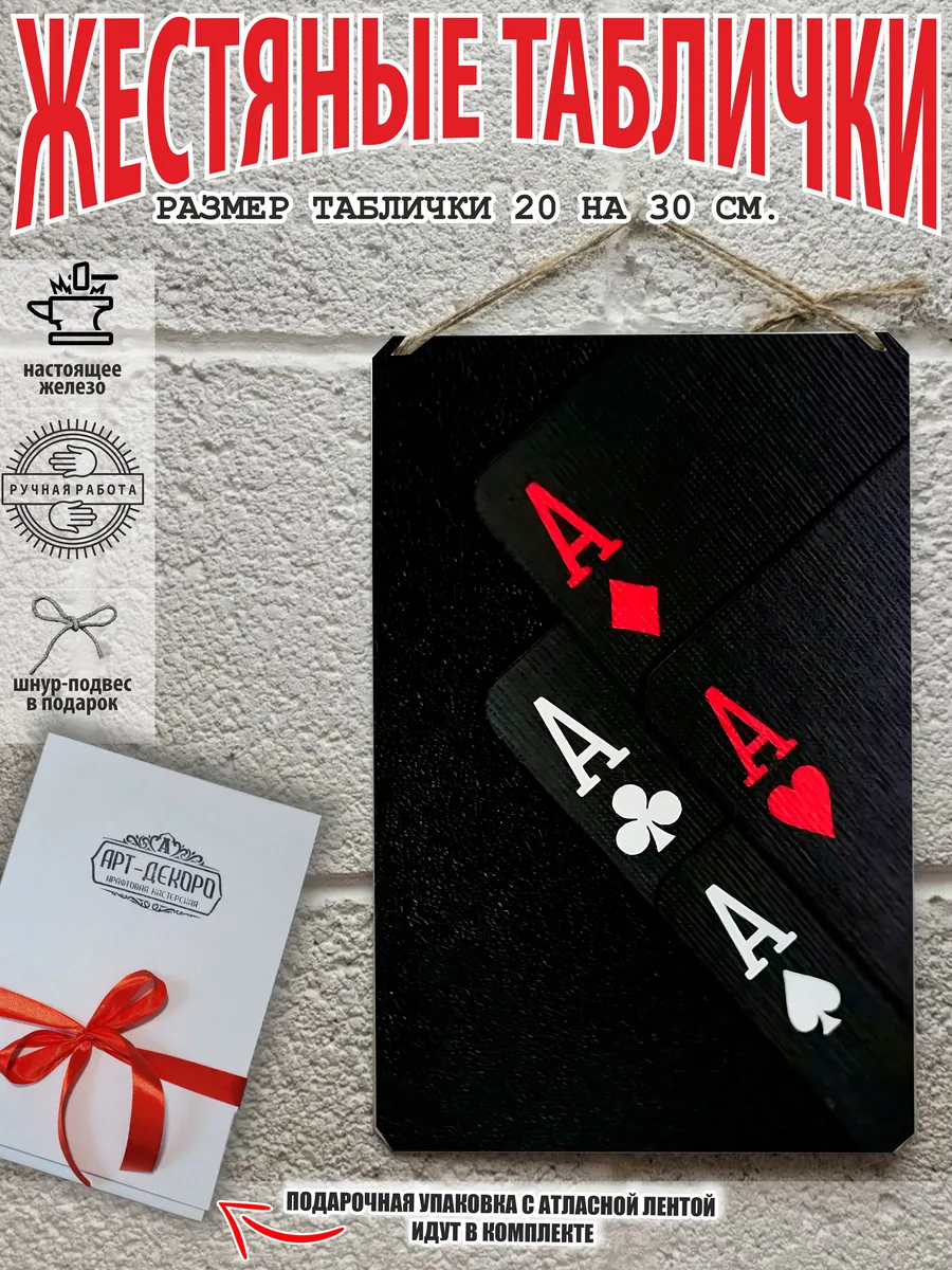 Представляем вам стильные и эффектные жестяные таблички с изображением игральных карт. Наши постеры — жестяные таблички покер, выполнены из металла, который отличается высоким качеством и долговечностью. Размер 20×30 см позволяет легко вписать наши картины в любой интерьер, будь то кухня, гостиная, офис или кафе. Почему стоит выбрать наш постер для интерьера? Яркие и насыщенные цвета не выгорают на солнце и делают ваше пространство выразительным и уникальным. Легкость в уходе: наши картины для интерьера, таблички блэк-джек покер мафия и постеры на стену виски и сигара можно легко мыть. Они не боятся влаги, что позволяет использовать их как в помещениях, так и на улице. Удобные варианты крепления: табличка может быть установлена на саморезы, гвозди, кнопки, клейкую ленту, магниты или повешена на шнур из натурального джута, который идет в комплекте. Упаковка: каждая табличка карта туз пики фэнтези красивые игральные карты колода казино аккуратно упакована в защитный пакет и дополнительно завернута в эко-картон, а также дополнительно в комплекте идет подарочная упаковка, атласная лента и открытка — что делает её отличным подарком на любой случай – от дня рождения до новоселья – готовый подарок. Мы гордимся тем, что предлагаем более 15 000 уникальных дизайнов, включая постеры на стену для интерьера, постер на заказ карты bicycle и прикольные металлические таблички, чтобы каждый мог найти что-то для себя. Наши постеры разделены на коллекции разных серий, что позволяет заказать несколько табличек в едином стиле и создать неповторимую композицию у вас дома, не упустите возможность сделать свой дом стильным – добавляйте товары в избранное, чтобы первыми узнавать о скидках и новинках! Создайте атмосферу уюта и стиля с нашими металлическими картинами и постерами для интерьера уже сегодня!