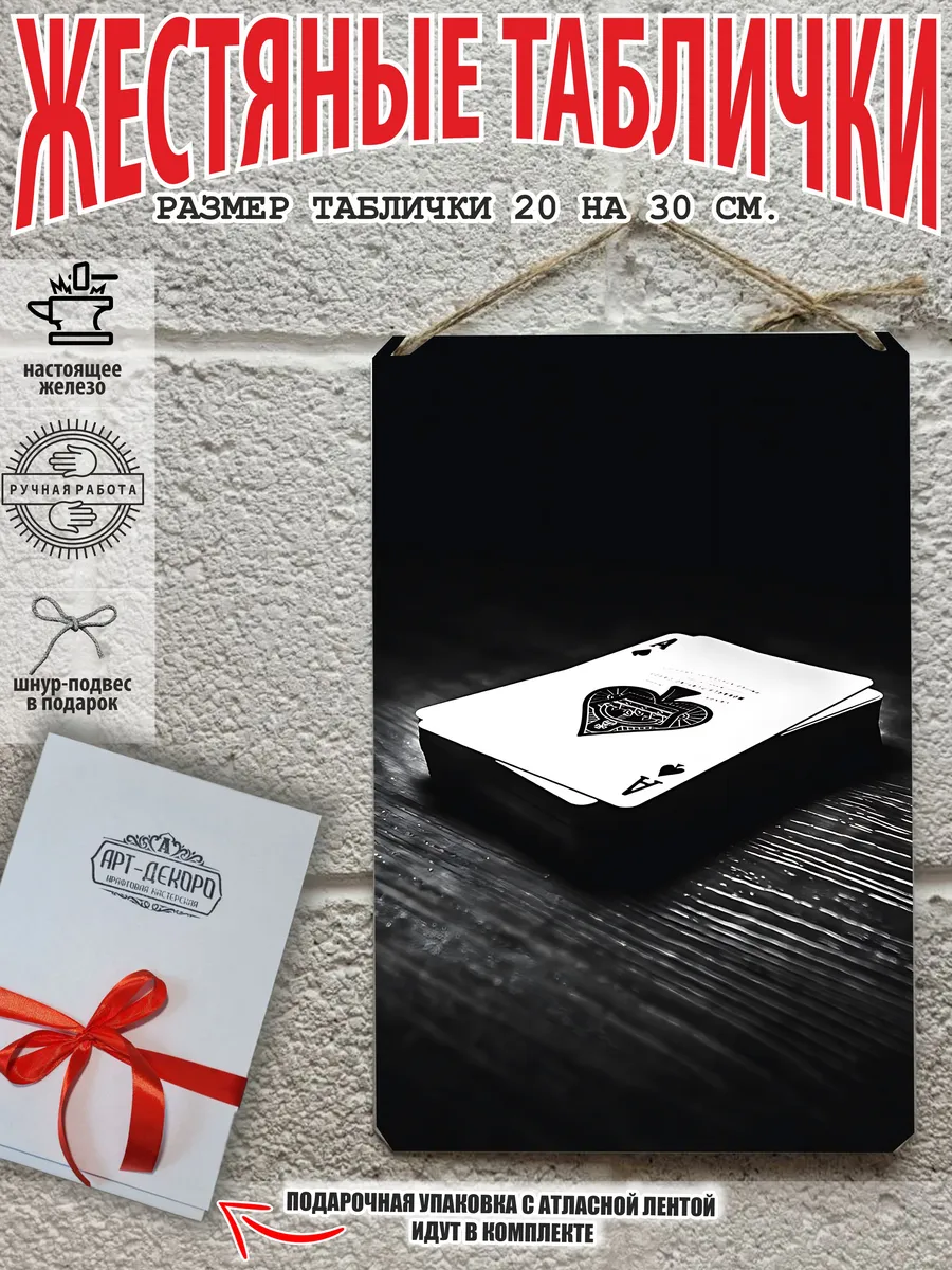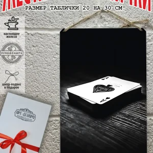 Представляем вам стильные и эффектные жестяные таблички с изображением игральных карт. Наши постеры — жестяные таблички покер, выполнены из металла, который отличается высоким качеством и долговечностью. Размер 20×30 см позволяет легко вписать наши картины в любой интерьер, будь то кухня, гостиная, офис или кафе. Почему стоит выбрать наш постер для интерьера? Яркие и насыщенные цвета не выгорают на солнце и делают ваше пространство выразительным и уникальным. Легкость в уходе: наши картины для интерьера, таблички блэк-джек покер мафия и постеры на стену виски и сигара можно легко мыть. Они не боятся влаги, что позволяет использовать их как в помещениях, так и на улице. Удобные варианты крепления: табличка может быть установлена на саморезы, гвозди, кнопки, клейкую ленту, магниты или повешена на шнур из натурального джута, который идет в комплекте. Упаковка: каждая табличка карта туз пики фэнтези красивые игральные карты колода казино аккуратно упакована в защитный пакет и дополнительно завернута в эко-картон, а также дополнительно в комплекте идет подарочная упаковка, атласная лента и открытка — что делает её отличным подарком на любой случай – от дня рождения до новоселья – готовый подарок. Мы гордимся тем, что предлагаем более 15 000 уникальных дизайнов, включая постеры на стену для интерьера, постер на заказ карты bicycle и прикольные металлические таблички, чтобы каждый мог найти что-то для себя. Наши постеры разделены на коллекции разных серий, что позволяет заказать несколько табличек в едином стиле и создать неповторимую композицию у вас дома, не упустите возможность сделать свой дом стильным – добавляйте товары в избранное, чтобы первыми узнавать о скидках и новинках! Создайте атмосферу уюта и стиля с нашими металлическими картинами и постерами для интерьера уже сегодня!