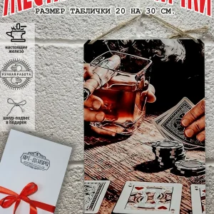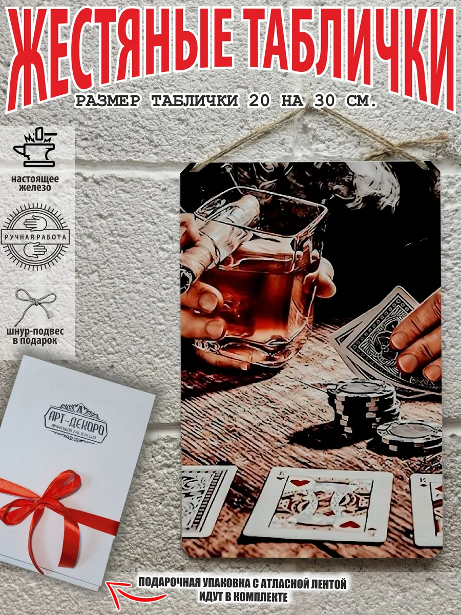 Представляем вам стильные и эффектные жестяные таблички с изображением игральных карт. Наши постеры — жестяные таблички покер, выполнены из металла, который отличается высоким качеством и долговечностью. Размер 20×30 см позволяет легко вписать наши картины в любой интерьер, будь то кухня, гостиная, офис или кафе. Почему стоит выбрать наш постер для интерьера? Яркие и насыщенные цвета не выгорают на солнце и делают ваше пространство выразительным и уникальным. Легкость в уходе: наши картины для интерьера, таблички блэк-джек покер мафия и постеры на стену виски и сигара можно легко мыть. Они не боятся влаги, что позволяет использовать их как в помещениях, так и на улице. Удобные варианты крепления: табличка может быть установлена на саморезы, гвозди, кнопки, клейкую ленту, магниты или повешена на шнур из натурального джута, который идет в комплекте. Упаковка: каждая табличка карта туз пики фэнтези красивые игральные карты колода казино аккуратно упакована в защитный пакет и дополнительно завернута в эко-картон, а также дополнительно в комплекте идет подарочная упаковка, атласная лента и открытка — что делает её отличным подарком на любой случай – от дня рождения до новоселья – готовый подарок. Мы гордимся тем, что предлагаем более 15 000 уникальных дизайнов, включая постеры на стену для интерьера, постер на заказ карты bicycle и прикольные металлические таблички, чтобы каждый мог найти что-то для себя. Наши постеры разделены на коллекции разных серий, что позволяет заказать несколько табличек в едином стиле и создать неповторимую композицию у вас дома, не упустите возможность сделать свой дом стильным – добавляйте товары в избранное, чтобы первыми узнавать о скидках и новинках! Создайте атмосферу уюта и стиля с нашими металлическими картинами и постерами для интерьера уже сегодня!