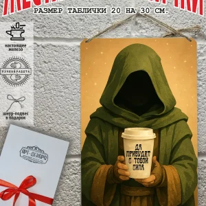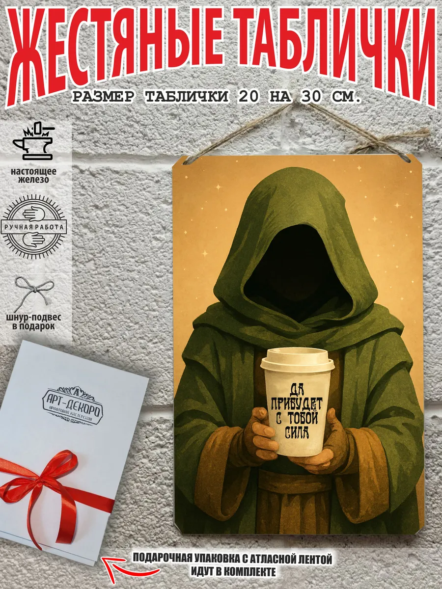 Металлическая табличка для интерьера кофе из 100% металла, размером 20 на 30 см. Если вы хотите порадовать своих себя или своих близких, то вам не придется думать над упаковкой, так как наши таблички кофе поставляются в подарочной упаковке с атласной лентой и открыткой. Это готовый недорогой подарок на все случаи жизни.