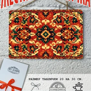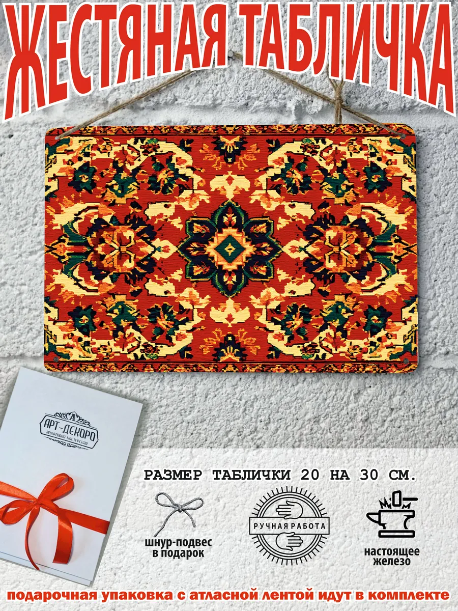 Ковер является многогранным символом: он олицетворяет уют и домашний очаг, а также выступает как оберег, отделяя мир человека от хаоса и защищая от зла. В культурном плане ковер символизирует статус и богатство, а в сказках — возможность путешествия и волшебства, например ковер-самолет. Каждый узор на ковре имеет свой смысл, от плодородия и долголетия до силы, мудрости и удачи, а центральный медальон может символизировать всевидящее око. В прошлом ковры были символом высокого социального положения, благосостояния и достатка. Узоры ковра, особенно центральный медальон, служат оберегом от зла и негативной энергии. Наша мастерская Арт-Декоро предлагает серию ковров на металлических табличках в стиле советских ковров в мини исполнении форматом 30 на 20 см. Такой ковер постер украсит рабочий стол, кухню, спальную, прихожую, гараж и любое место которое вы захотите. Наши постеры идут в комплекте с подарочной упаковкой, что делает его готовым подарком по любому поводу. Отличный подарок на день рождения для любителей советской эстетики. В комплекте так же идет шнур-подвес что упрощает его размещение на стене.