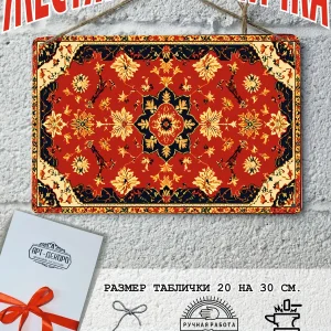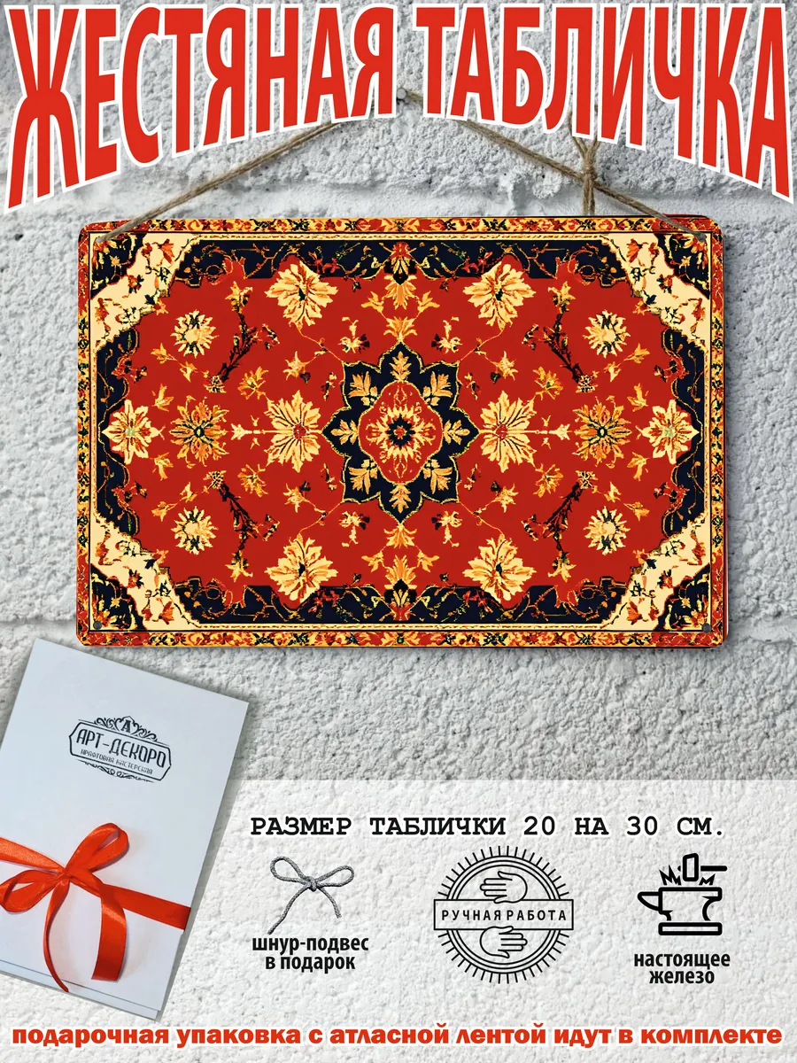 Ковер является многогранным символом: он олицетворяет уют и домашний очаг, а также выступает как оберег, отделяя мир человека от хаоса и защищая от зла. В культурном плане ковер символизирует статус и богатство, а в сказках — возможность путешествия и волшебства, например ковер-самолет. Каждый узор на ковре имеет свой смысл, от плодородия и долголетия до силы, мудрости и удачи, а центральный медальон может символизировать всевидящее око. В прошлом ковры были символом высокого социального положения, благосостояния и достатка. Узоры ковра, особенно центральный медальон, служат оберегом от зла и негативной энергии. Наша мастерская Арт-Декоро предлагает серию ковров на металлических табличках в стиле советских ковров в мини исполнении форматом 30 на 20 см. Такой ковер постер украсит рабочий стол, кухню, спальную, прихожую, гараж и любое место которое вы захотите. Наши постеры идут в комплекте с подарочной упаковкой, что делает его готовым подарком по любому поводу. Отличный подарок на день рождения для любителей советской эстетики. В комплекте так же идет шнур-подвес что упрощает его размещение на стене.