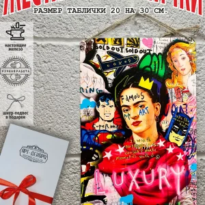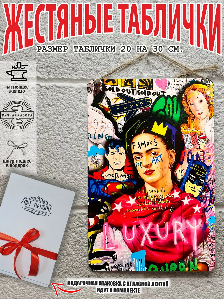 Интерьерная жестяная картина на стену с изображением знаменитостей выполненная из 100% металла- это отличный подарок, а также классный декор для помещения. Постер с изображением известных людей крепится на саморезы-шурупы, в табличке по углам имеются отверстия или на шнур-подвес из натурального джута, который идёт в подарок.