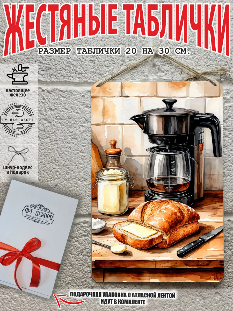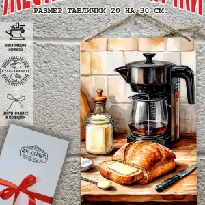 Металлическая табличка для интерьера кофе из 100% металла, размером 20 на 30 см. Если вы хотите порадовать своих себя или своих близких, то вам не придется думать над упаковкой, так как наши таблички кофе поставляются в подарочной упаковке с атласной лентой и открыткой. Это готовый недорогой подарок на все случаи жизни.