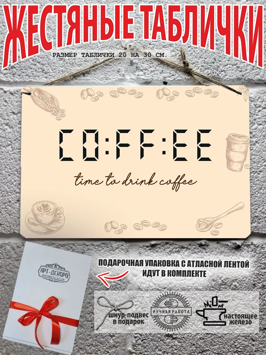 Металлическая табличка для интерьера кофе из 100% металла, размером 20 на 30 см. Если вы хотите порадовать своих себя или своих близких, то вам не придется думать над упаковкой, так как наши таблички кофе поставляются в подарочной упаковке с атласной лентой и открыткой. Это готовый недорогой подарок на все случаи жизни.