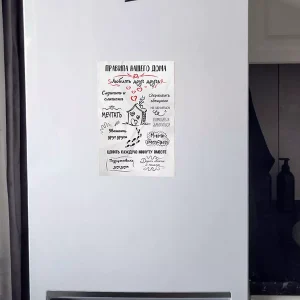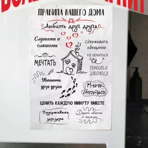 Только наши большие магниты можно мыть, они не выцветают долгие годы. Магнит плакаты правила семьи, основные семейные правила, прикольные надписи на магнитах — все это сочетается в наших изделиях. Мы гордимся тем, что изображение наносится прямо на магнит — это новая технология. Это не наклейка, что гарантирует ее долговечность и надежность, при этом магнит можно всегда снять, он не оставляет следов.