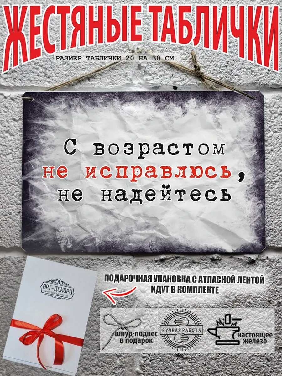 Обратите внимание! У нас все таблички идут сериями, можно создать отличную композицию в одном стиле. Кроме того, таблички это стильный и недорогой подарок по любому поводу. Прикольные штуки железная табличка картинки мотиваторы позитивные и демотиваторы из 100% металла от нашего бренда будет прекрасным украшением для квартиры, дома, офиса, бара или кафе. Мотивация это прикол, часть нашей жизни, картина мотиватор всегда улучшает настроение. Сочетая в себе эстетику и прочность, декоративная металлические мотивационные карточки являются непременным элементом декора как для внутренних помещений, так и для уличных зон. Выберите из нашего широкого ассортимента аксессуар, который подойдет именно вам. Жестяная табличка Арт-Декоро крепится на саморезы, шурупы или на специальный шнур из натурального джута который идет в комплекте с каждым заказом как бесплатный подарок, что позволяет разнообразить способы использования. Плакаты с приколами можно повесить на стену в гостиной, спальне, кухне или на улице, чтобы создать атмосферу, которая отражает индивидуальность. Таблички можно мыть, они не выцветают долгие годы. Картина открытки постер плакат стикеры наклейки приколы мотивация все это сочетается в наших изделиях. Мы гордимся тем, что каждое изделие изготовлено из настоящего металла, краска наносится прямо на железо. Это гарантирует ее долговечность и надежность. Красивая и изысканная отделка обеспечивает эффектный внешний вид и придает обстановке особое очарование. Подарите возможность добавить изюминку в интерьер и превратите пространство в уникальное, а также уютное место, которое будет отличаться от всех остальных. В нашем магазине Вы найдёте большой выбор декора интерьера и создадите превосходную обстановку.