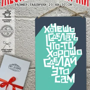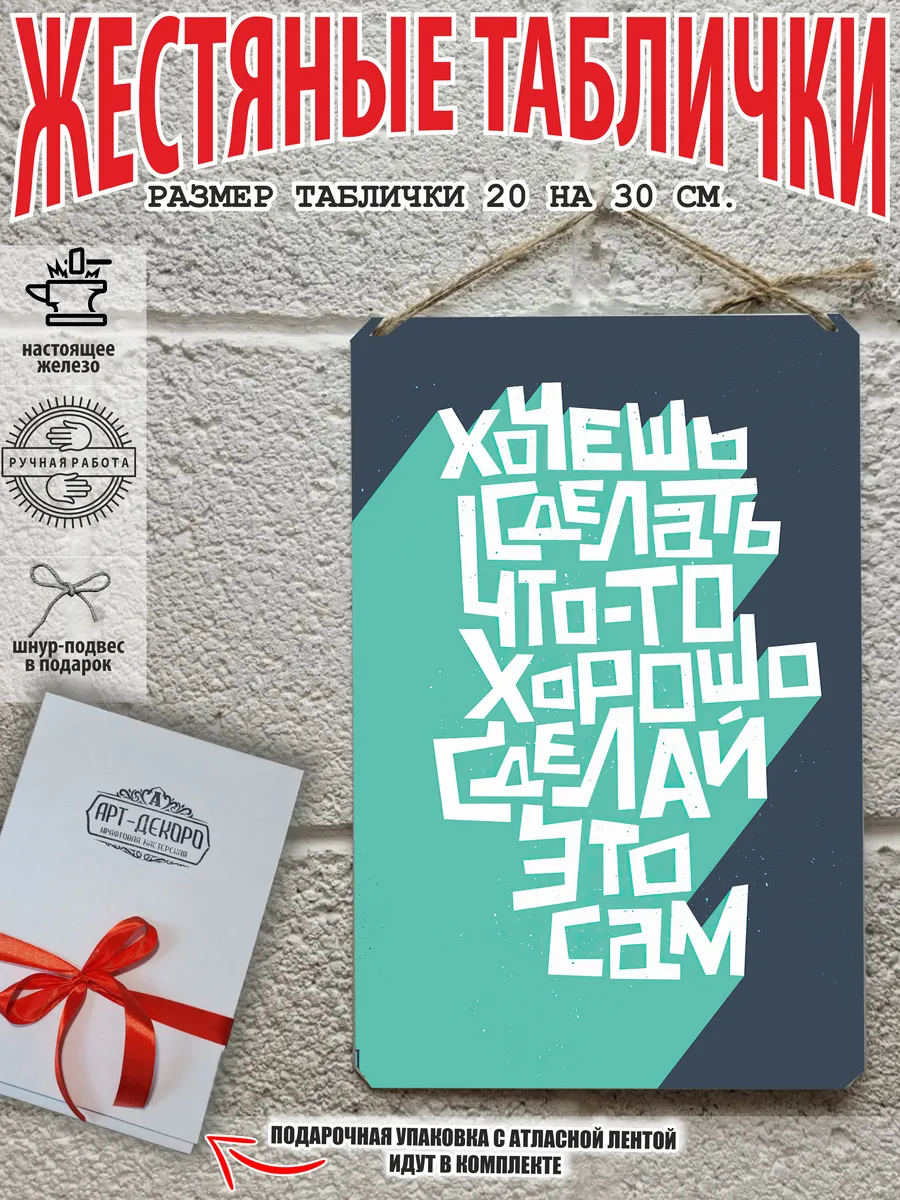 Обратите внимание! У нас все таблички идут сериями, можно создать отличную композицию в одном стиле. Кроме того, таблички это стильный и недорогой подарок по любому поводу. Прикольные штуки железная табличка картинки мотиваторы позитивные и демотиваторы из 100% металла от нашего бренда будет прекрасным украшением для квартиры, дома, офиса, бара или кафе. Мотивация это прикол, часть нашей жизни, картина мотиватор всегда улучшает настроение. Сочетая в себе эстетику и прочность, декоративная металлические мотивационные карточки являются непременным элементом декора как для внутренних помещений, так и для уличных зон. Выберите из нашего широкого ассортимента аксессуар, который подойдет именно вам. Жестяная табличка Арт-Декоро крепится на саморезы, шурупы или на специальный шнур из натурального джута который идет в комплекте с каждым заказом как бесплатный подарок, что позволяет разнообразить способы использования. Плакаты с приколами можно повесить на стену в гостиной, спальне, кухне или на улице, чтобы создать атмосферу, которая отражает индивидуальность. Таблички можно мыть, они не выцветают долгие годы. Картина открытки постер плакат стикеры наклейки приколы мотивация все это сочетается в наших изделиях. Мы гордимся тем, что каждое изделие изготовлено из настоящего металла, краска наносится прямо на железо. Это гарантирует ее долговечность и надежность. Красивая и изысканная отделка обеспечивает эффектный внешний вид и придает обстановке особое очарование. Подарите возможность добавить изюминку в интерьер и превратите пространство в уникальное, а также уютное место, которое будет отличаться от всех остальных. В нашем магазине Вы найдёте большой выбор декора интерьера и создадите превосходную обстановку.