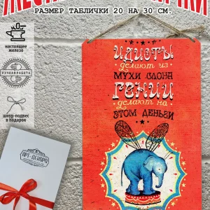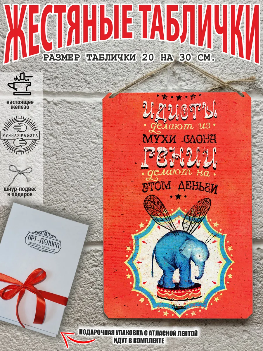 Шрифтовой плакат: «Идиоты делают из мухи слдона, гении делают на этом деньги» из 100% металла от нашего бренда будет прекрасным украшением для квартиры, дома, офиса, бара или кафе. Мотивация это прикол, часть нашей жизни, картина мотиватор всегда улучшает настроение. Сочетая в себе эстетику и прочность, юмор со смыслом, декоративная металлические мотивационные постер про деньги являются непременным элементом декора как для внутренних помещений, так и для уличных зон. Выберите из нашего широкого ассортимента аксессуар, который подойдет именно вам. Жестяная табличка Арт-Декоро крепится на саморезы, шурупы или на специальный шнур из натурального джута который идет в комплекте с каждым заказом как бесплатный подарок, что позволяет разнообразить способы использования. Таблички готовый подарок для экономиста можно мыть, они не выцветают долгие годы. Мы гордимся тем, что каждое изделие изготовлено из настоящего металла, краска наносится прямо на железо. Это гарантирует ее долговечность и надежность. Красивая и изысканная отделка обеспечивает эффектный внешний вид и придает обстановке особое очарование. Подарите бухгалтеру возможность добавить изюминку в интерьер и превратите пространство в уникальное, а также уютное место, которое будет отличаться от всех остальных. В нашем магазине Вы найдёте большой выбор декора интерьера и создадите превосходную обстановку.