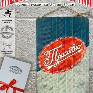 Железная табличка плакат мотивирующая надпись на стену: «Приятно» из 100% металла от нашего бренда будет прекрасным украшением для квартиры, дома, офиса, бара или кафе. А так же готовый подарок с юмором брату, мужу, другу, сестре, коллеге, людимому по любому поводу: день рожденья, юбилей, 23 февраля, 8 марта. Подарочная упаковка с атласной лентой и открыткой для подписи идет в комплекте.