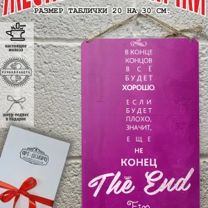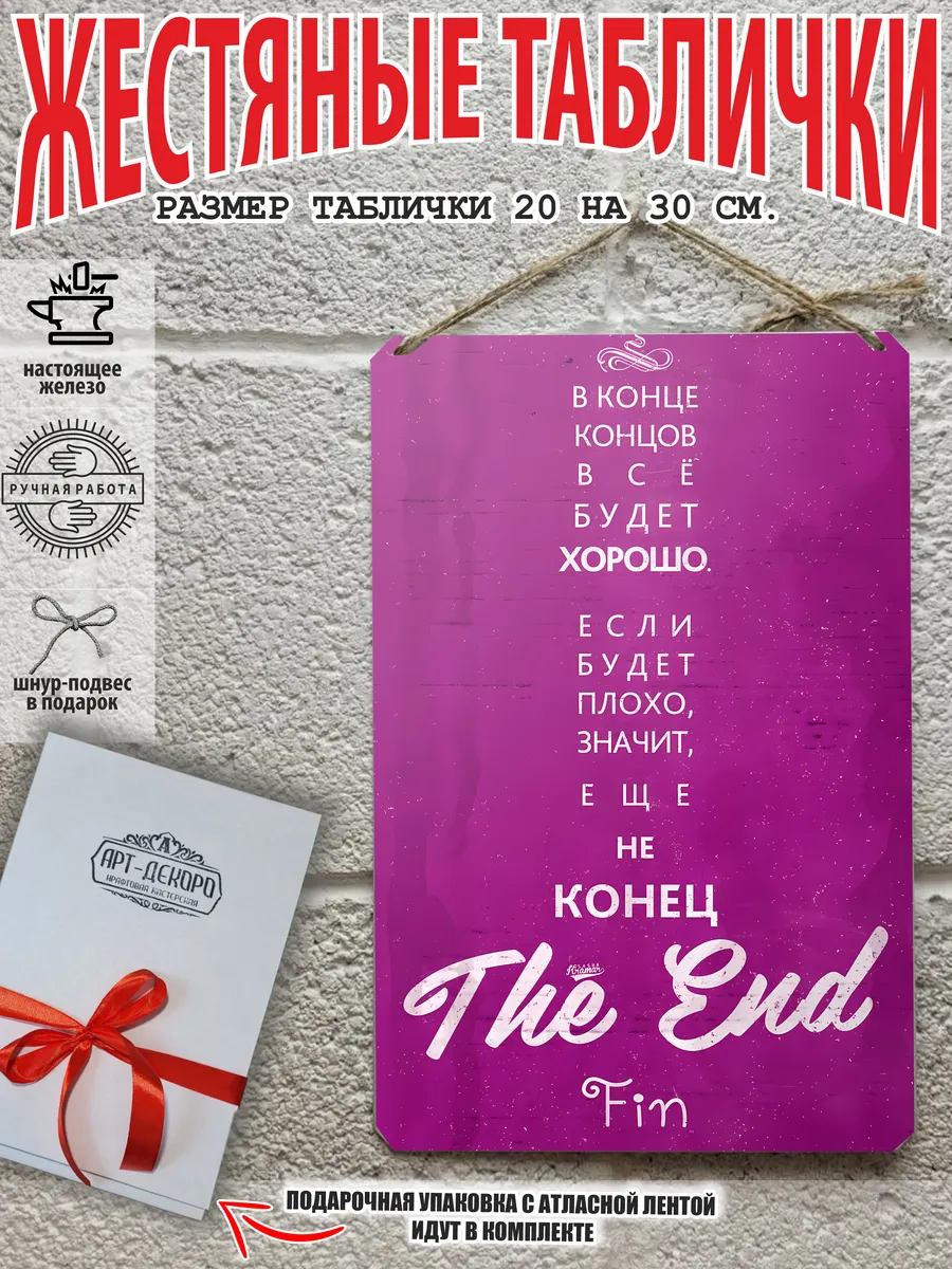 Железная табличка: «В конце концов все будет хорошо. Если будет плохо, значит еще не конец. The end.» из 100% металла от нашего бренда будет прекрасным украшением для квартиры, дома, офиса, бара или кафе. Мотивация это прикол, часть нашей жизни, картина мотиватор всегда улучшает настроение. Сочетая в себе эстетику и прочность, декоративная металлические мотивационные карточки являются непременным элементом декора как для внутренних помещений, так и для уличных зон. Выберите из нашего широкого ассортимента аксессуар, который подойдет именно вам. Жестяная табличка Арт-Декоро крепится на саморезы, шурупы или на специальный шнур из натурального джута который идет в комплекте с каждым заказом как бесплатный подарок, что позволяет разнообразить способы использования. Плакаты с приколами можно повесить на стену в гостиной, спальне, кухне или на улице, чтобы создать атмосферу, которая отражает индивидуальность. Таблички можно мыть, они не выцветают долгие годы. Картина открытки постер плакат стикеры наклейки приколы мотивация все это сочетается в наших изделиях. Мы гордимся тем, что каждое изделие изготовлено из настоящего металла, краска наносится прямо на железо. Это гарантирует ее долговечность и надежность. Красивая и изысканная отделка обеспечивает эффектный внешний вид и придает обстановке особое очарование. Подарите возможность добавить изюминку в интерьер и превратите пространство в уникальное, а также уютное место, которое будет отличаться от всех остальных. В нашем магазине Вы найдёте большой выбор декора интерьера и создадите превосходную обстановку.