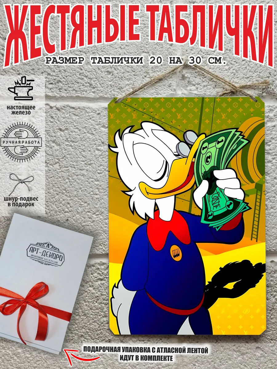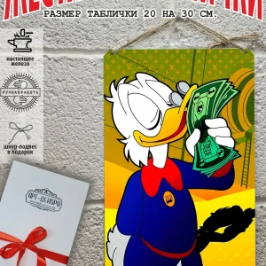 Скрудж Макдак символизирует богатство, достигнутое благодаря упорному труду, целеустремлённости и предпринимательской хватке. Также он является символом предприимчивости, темперамента и умения выживать в реалиях американской мультипликации и комиксов. Некоторые цитаты Скруджа Макдака про деньги: «Там, где вы видите старый сарай, я вижу дело с оборотом в миллион долларов!». «Деньги нельзя откладывать, их нужно вкладывать». «Чёрт побери! Сейчас хороших костюмов не шьют, 30–40 лет — и они рвутся». Несмотря на свои миллионы, Скрудж покупал качественную одежду и обувь, которую можно носить десятилетиями. «Деньги больше помогут, когда нет удачи, чем удача, когда нет денег». «Дорогая, я, конечно, хотел купить тебе бриллиантовое кольцо, но ювелирные были закрыты, поэтому я купил тебе йогурт». Так Скрудж хотел сделать приятное своей возлюбленной. «За маленький кусочек золота можно получить очень-очень много денег… Ха-ха! И для игры в шашки оно очень подходит». «Экономить, конечно, надо, но при чём тут мой шоколад?». «Я самая богатая утка на земле, потому что не трачу своих денег». Скрудж любил пользоваться бесплатными возможностями, которые экономили его деньги. Представляем вам стильные и эффектные жестяные таблички с изображением скруджа мак дака. Наши постеры деньги — жестяные таблички, выполнены из металла, который отличается высоким качеством и долговечностью. Размер 20×30 см позволяет легко вписать наши картины в любой интерьер, будь то кухня, гостиная, офис или кафе. Почему стоит выбрать наш постер для интерьера скрудж макдак? Яркие и насыщенные цвета не выгорают на солнце и делают ваше пространство выразительным и уникальным. Легкость в уходе: наши картины для интерьера, таблички на дверь и постеры на стену можно легко мыть. Они не боятся влаги, что позволяет использовать их как в помещениях, так и на улице. Удобные варианты крепления: табличка может быть установлена на саморезы, гвозди, кнопки, клейкую ленту, магниты или повешена на шнур из натурального джута, который идет в комплекте. Упаковка: каждая табличка аккуратно упакована в защитный пакет и дополнительно завернута в эко-картон, а также дополнительно в комплекте идет подарочная упаковка, атласная лента и открытка — что делает её отличным подарком на любой случай – от дня рождения до новоселья – готовый подарок. Мы гордимся тем, что предлагаем более 15 000 уникальных дизайнов, включая постеры на стену для интерьера, постер на заказ и прикольные металлические таблички, чтобы каждый мог найти что-то для себя. Наши постеры разделены на коллекции разных серий, что позволяет заказать несколько табличек в едином стиле и создать неповторимую композицию у вас дома, не упустите возможность сделать свой дом стильным – добавляйте товары в избранное, чтобы первыми узнавать о скидках и новинках! Создайте атмосферу уюта и стиля с нашими металлическими картинами и постерами для интерьера уже сегодня!
